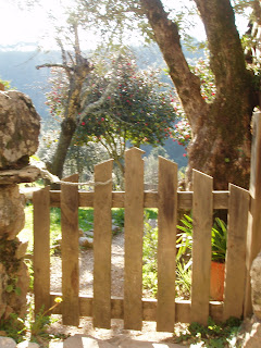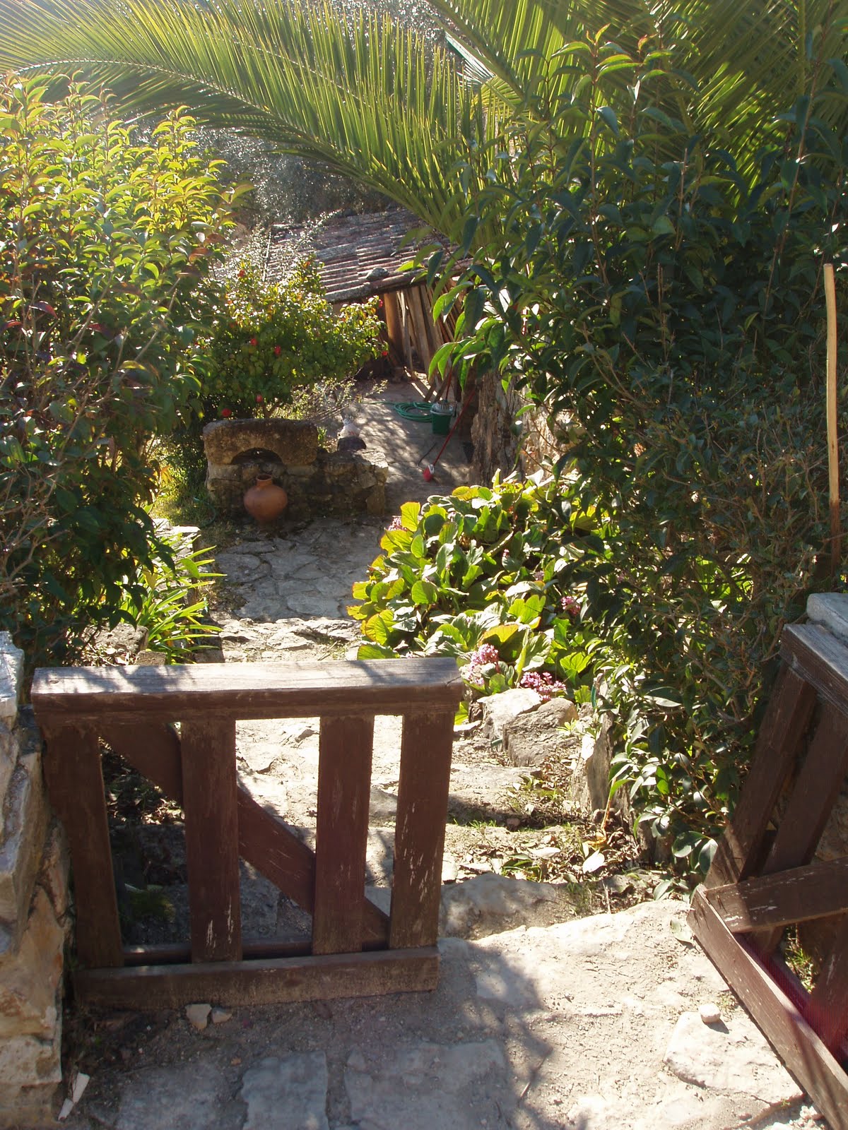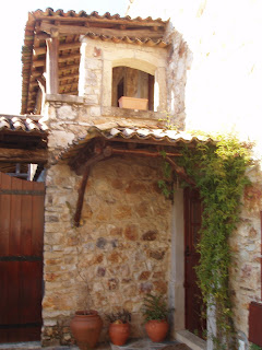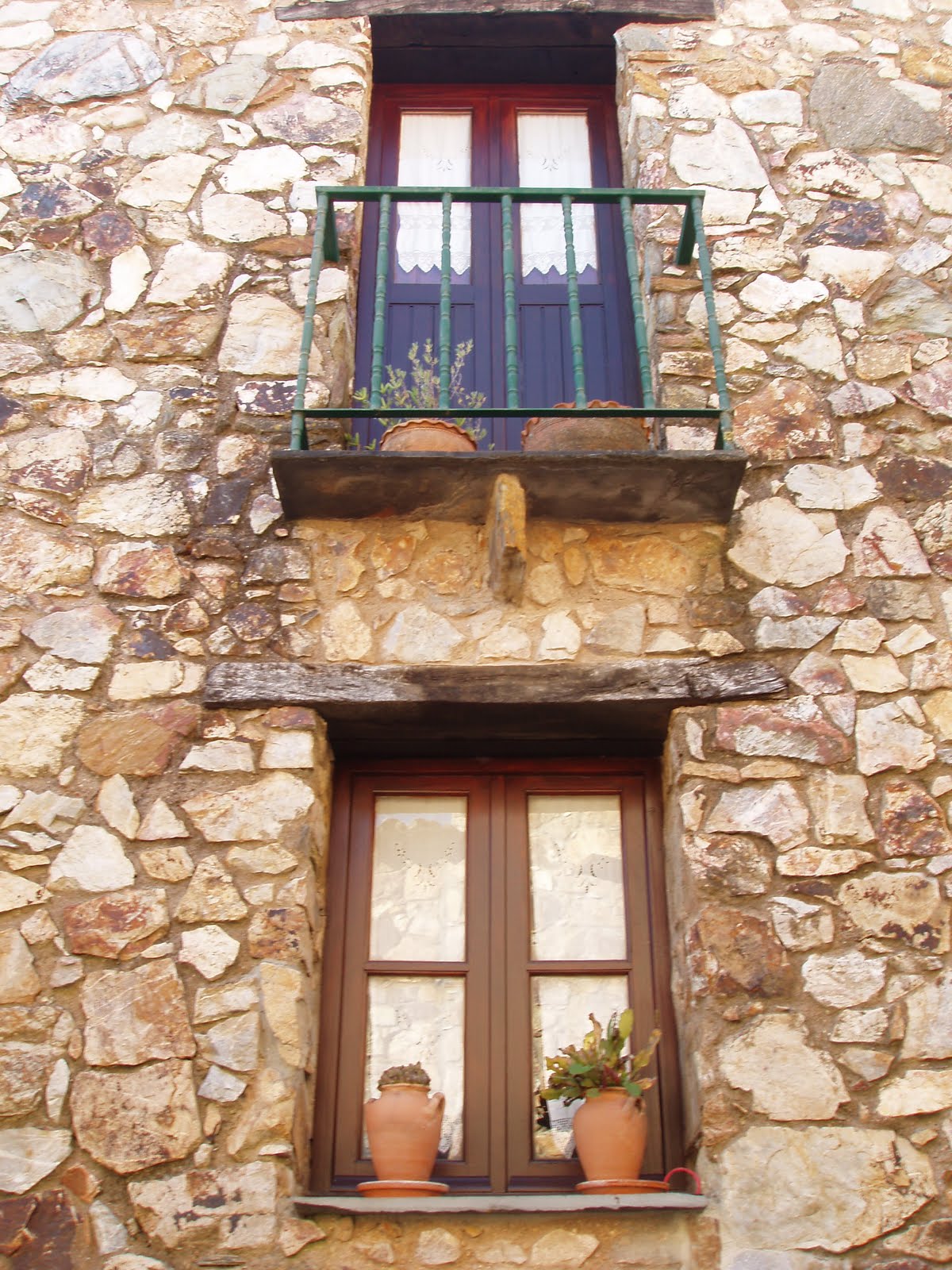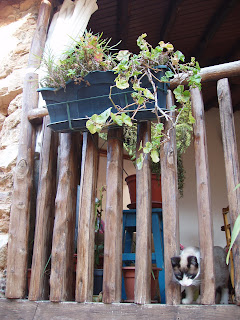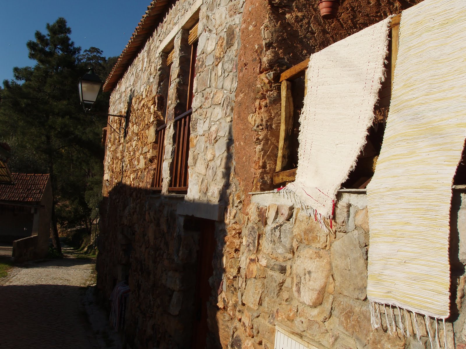 Achei muito bonito, muito rústico, muito acolhedor. Sejam as escadinhas, os corrimões e varandas em madeira, os vasos floridos, as cortinas em renda, as traves de madeira grossa em jeito de cimalha a segurar portas e janelas, sejam as fechaduras, algumas em madeira a imitar os antigos ferrolhos e a telha de canudo mourisca tão castiça.