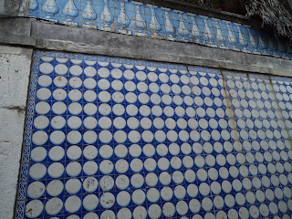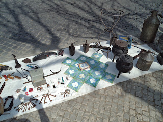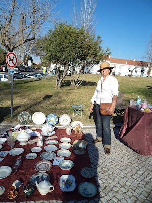 Feira de Azeitão - sol abrasador - muitos feirantes não habituais. Gente somente a passear, compradores poucos, manhã fraca, só o final da tarde aqueceu a carteira. Houve colegas que nem se estrearam. A D. Ana minha conhecida das feiras de Lisboa, dizia-me "hoje ainda não me estreei e tinha lugar pago na Avª da Liberdade, nada barato, 17€ ". Naquilo vi chegar do almoço a D. São, via-a despejar um saquinho de açúcar em volta da banca, fiquei intrigada...ao revelar o insólito à D. Ana, esta vira-se para mim e diz "já não sei em que feira foi vi fazerem o mesmo - ritual para chamar a freguesia - puseram também na minha banca, mas não deu resultado nenhum"...via jeito de ser a minha pior feira em termos monetários - o meu colega de frente, um rapaz simpático que conheço da feira de Setúbal - Paulo Filipe, abeira-se de mim e, dá-me uma moeda de 10 réis do reinado de D. Luís I com a retórica " é para não estar triste" - de tarde deu-me outra do reinado de D. Carlos - " esta foi pela conversa"...apesar de ter posto letreiros com preços de saldo - salvei o julgamento, estreando-me ao vender dois livros a um senhor magro, tipo intelectual, apressado para eu não reconhecer os títulos - então não os sabia de cor - "um deles era um inquérito sobre o orgasmo na mulher, o outro sexo em grupo" - rápido a pagar e a descer a escadaria no sentido do carro, para meu espanto entrou num jipe Porche...e, só pagou por dois bons livros 2 €, porque o Sr. meu marido ao expo-los na banca decidiu desvalorizar os temas. Vendi para salvar a honra do convento mais livros, uma travessa e um prato. Curiosamente a senhora que os comprou ficou encantada com a travessa inglesa em tom azul liláz lindíssima, gateada - dizia para a mãe que a acompanhava - " elas (as filhas) só gostam das peças assim, partidas e com gatos - ofereço e ainda vou ouvir coices..." Perguntaram o preço das terrinas, da jarra da Marinha Grande em azuis a imitar a boémia e, ainda de uma garrafa. A foto apresenta apenas metade do estaminé, falta ainda a bancada e outra no chão com livros.A melhor feira em termos organizativos, a senhora encarregue - D. Lúcia, além de afável, é muito compreensiva e calma. Quem a escolheu sabe diagnosticar perfiz de profissionalidade, não há dúvida alguma, sempre com o mesmo sorriso - acode aqui e ali, a todos - nunca sai do registo de atendimento personalizado, eficaz. Um exemplo a seguir para outras feiras, nomeadamente para a da Costa da Caparica onde nos últimos tempos assisti a uma rebeldia por falta de um elemento organizativo da Junta, que em tempos houve, e por não conseguir impor a sua determinação - no dizer de colegas, deixou-se amedrontar pela má língua, e atitudes nefastas de alguns vendedores sem escrúpulos, e egoístas, que não gostam de obedecer e respeitar os demais. Incrivelmente esta feira parou um mês para remodelação.
