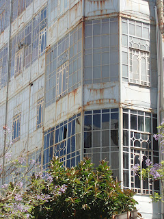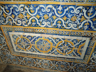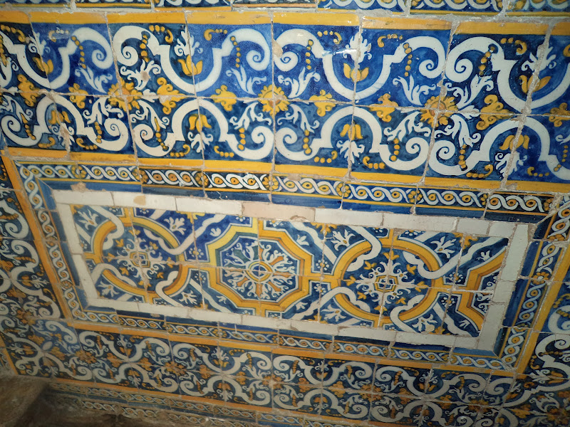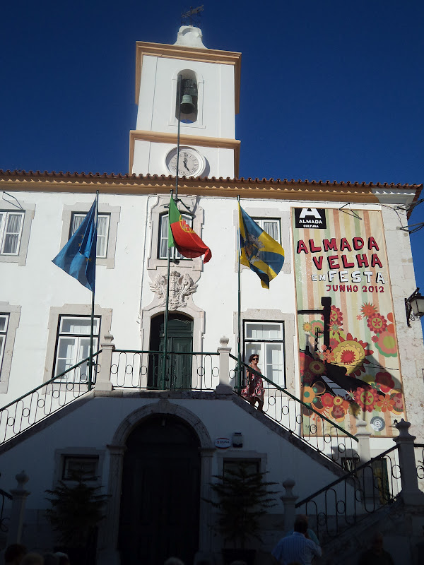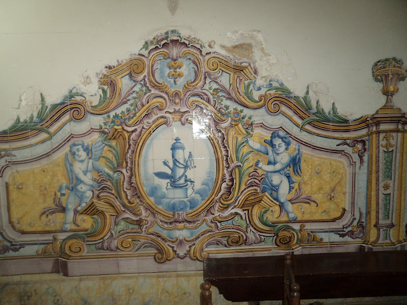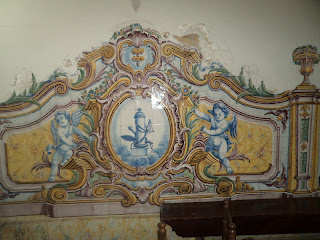 Acabei por me perder no papel de zeladora ... o meu olhar avistou ao longe uma casa alta com uma tira de azulejos grandes - Arte Nova - serão de Aveiro? com remates a Coruchéus - nome dado aos terminais que podem ter vários formatos: Pianhas; urnas; fogachos ou fogaréus; vasos; pinhas; figuras humanas; o mundo e,...de muitos telhados caraterísticas das terras ribeirinhas do Tejo: Vila Franca de Xira, Alhandra, Paço d'Arcos, Almada, Moita; Setúbal e,...Alcochete. A foto da direita foi tirada na véspera em Setúbal da minha banca. Quem me lê sabe que adoro azulejaria.Os terminais são coruchéus - Mundo- intervalados por outros em forma de pinha.