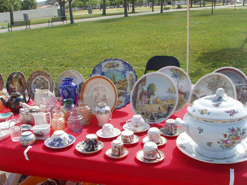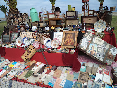-Aleijarei o passo com um sorriso depois de um piropo com soslaio malandreco... estava na hora de "dar corda aos chinelos". Parei para cumprimentar o Paulo e a mulher Clara - trouxeram a nora com uma amiga - montaram uma banca de roupa e sapatos em 2ª mão - debalde não se estrearam. Mais acima estava a D. Maria de Jesus com outra amiga - tristes pouco tinham faturado - queriam despachar vidros opacos que outro colega "rodas curtas" e chapelinho tipo Robin dos Bosques com andar à pato, dizia ser murano...esqueceu-se de dizer antes - Tipo - em frente a Fernanda e o marido Fernando, cegou há tempos...invejo a paciência dela, na frente um colega de bengalinha com mobiliário e objetos bons, já no largo encontrei o Sr. António (GNR) com uma pequena prensa, julgava ele que teria comprador para ela a fazer fé na última feira que aqui vendeu uma igual, na sua frente os irmãos Luís Miguel, meu colega profissional ao quadrado e o Paulo, artista com uma banda, tinham peças na banca muito boas, algumas de raridade - estavam desanimados - ninguém tinha perguntado por dois banquinhos de pernas altas em preto a imitar patas de leão com garras douradas e estofos de seda lavrada purpura. Comprei um prato covo de faiança partido na amiga do Santiago - Carla - sobre o qual aprendi da boca dele - um prato Ti Emila. Seguramente saiu de uma fábrica entre Aveiro e Alcobaça - nome dado pelos "ciganos" que os compravam a uma feirante que teria o nome de Emília...vou fazer um post no Lérias...sobre ela haveria de ficar com dúvidas sobre a sua seriedade...sobre o preço fez-me desconto, à posterior disse -me outro, o mesmo ocorreu uma 2ª vez...não simpatizo com gente desta laia, nem um bocadinho...o seu olhar esverdeado sardão, não nega matreirice!