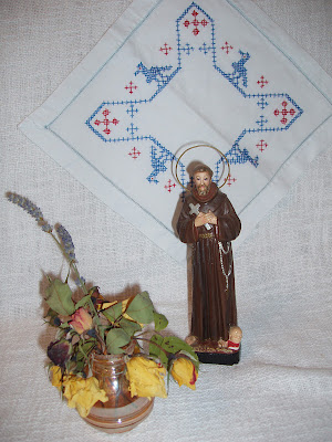Relaxei no caminho a pensar nos cachos floridos anilados das jacarandá, na véspera em Setúbal - por aqui só vi árvores da mesma espécie de flores em amarelo ocre...o Paulo de Setúbal apanhou algumas e enfeitou a banca - Nunca conheci um homem tão vaidoso com a apresentação dos seus objetos que troca por outros se não os vende - em Setúbal vi um almofariz de "brecha" da Arrábida andava com ele há um mês, passou em menos de uma hora por três mãos contando com a dele...o mesmo com uma caixa de pesos em latão.Delira em faturar, aguçar o apetite do comprador pela variedade também na fidelização para visitas futuras ao seu estaminé montado em escalada de altares. Criativo com "bichos carpinteiros" não pára quieto - afinal ele é um artista na arte do desenho!