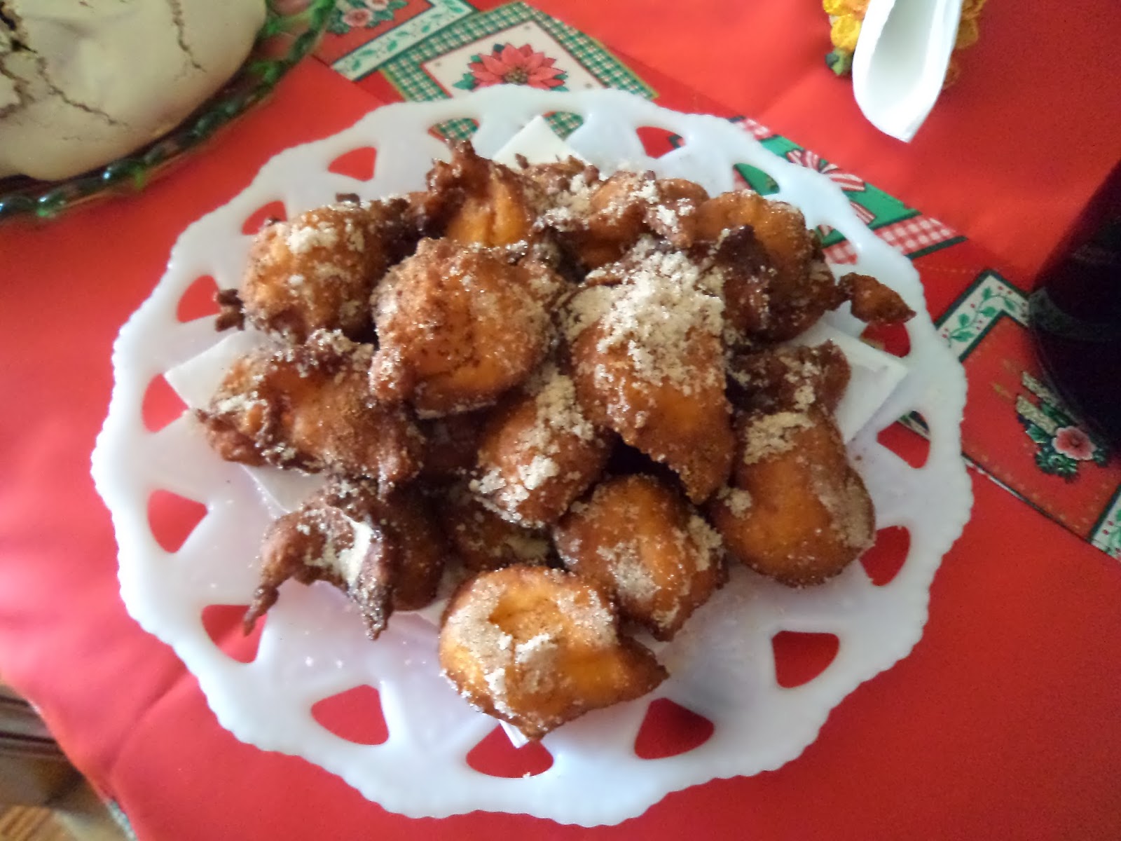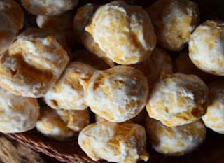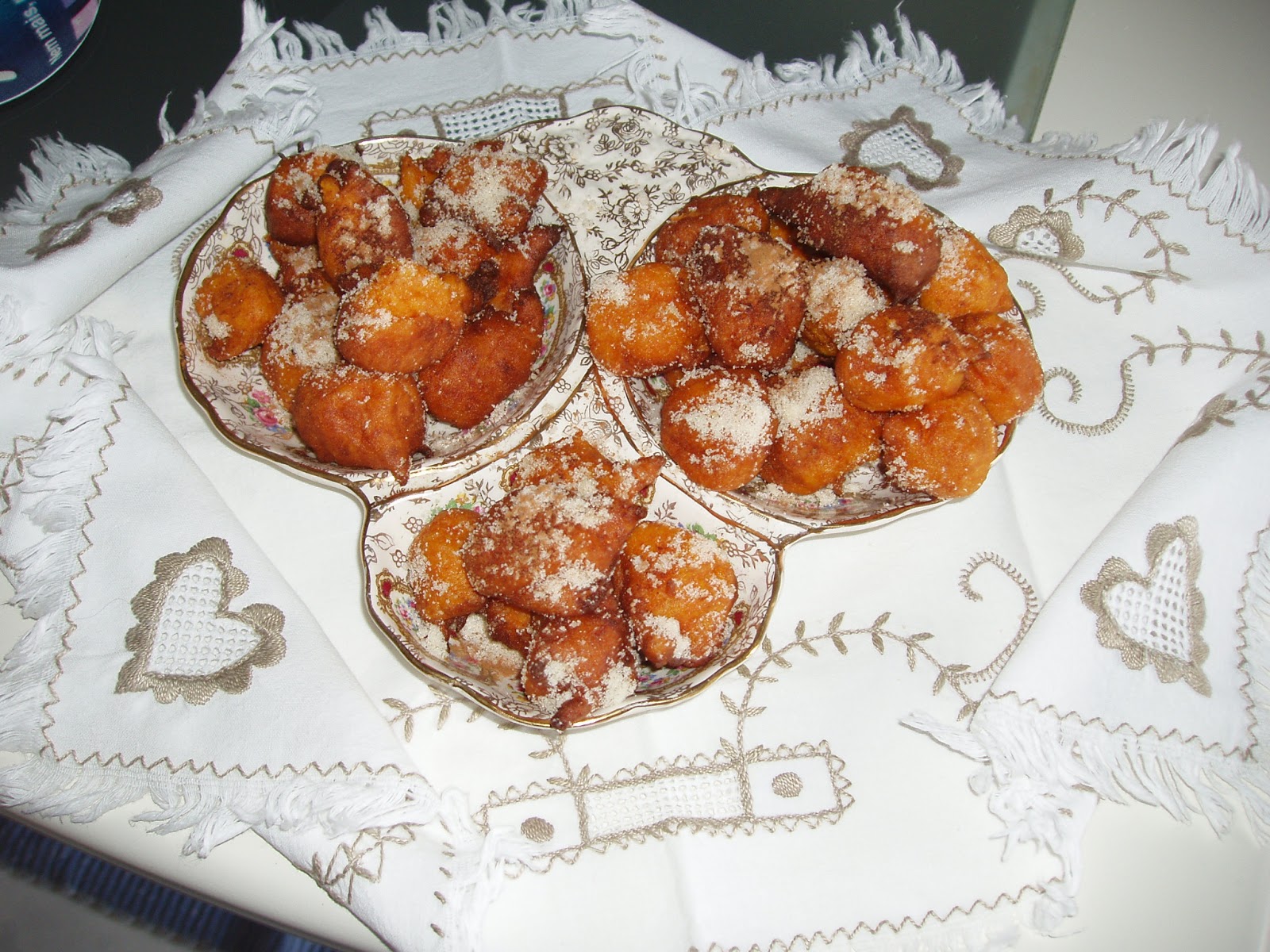 uma laranja, pixel de aguardente e pouquíssima farinha com fermento, fica de pasta mole. Fritam-se colheradas em óleo quente.Cobrem-se com açúcar amarelo e canela.
