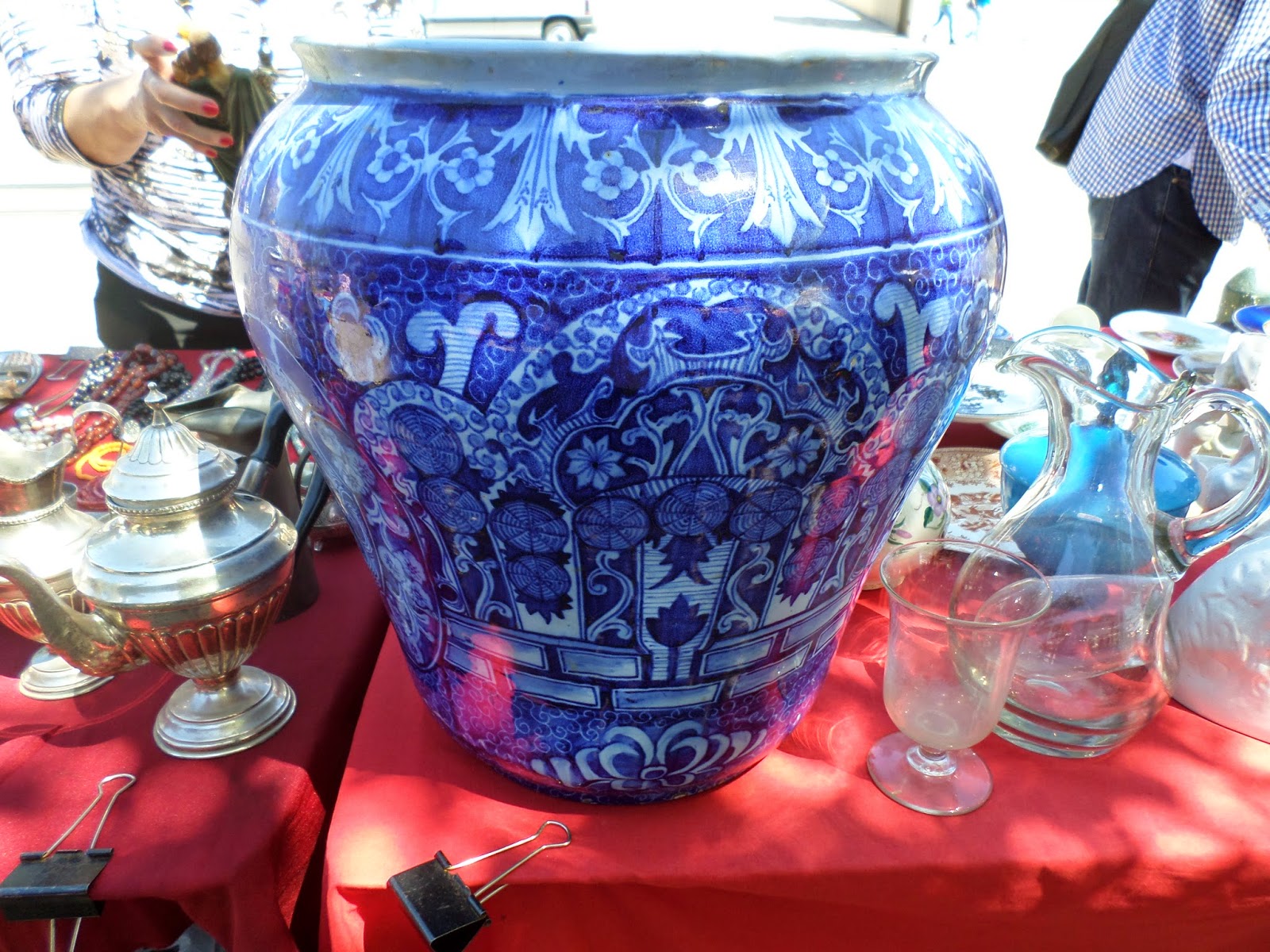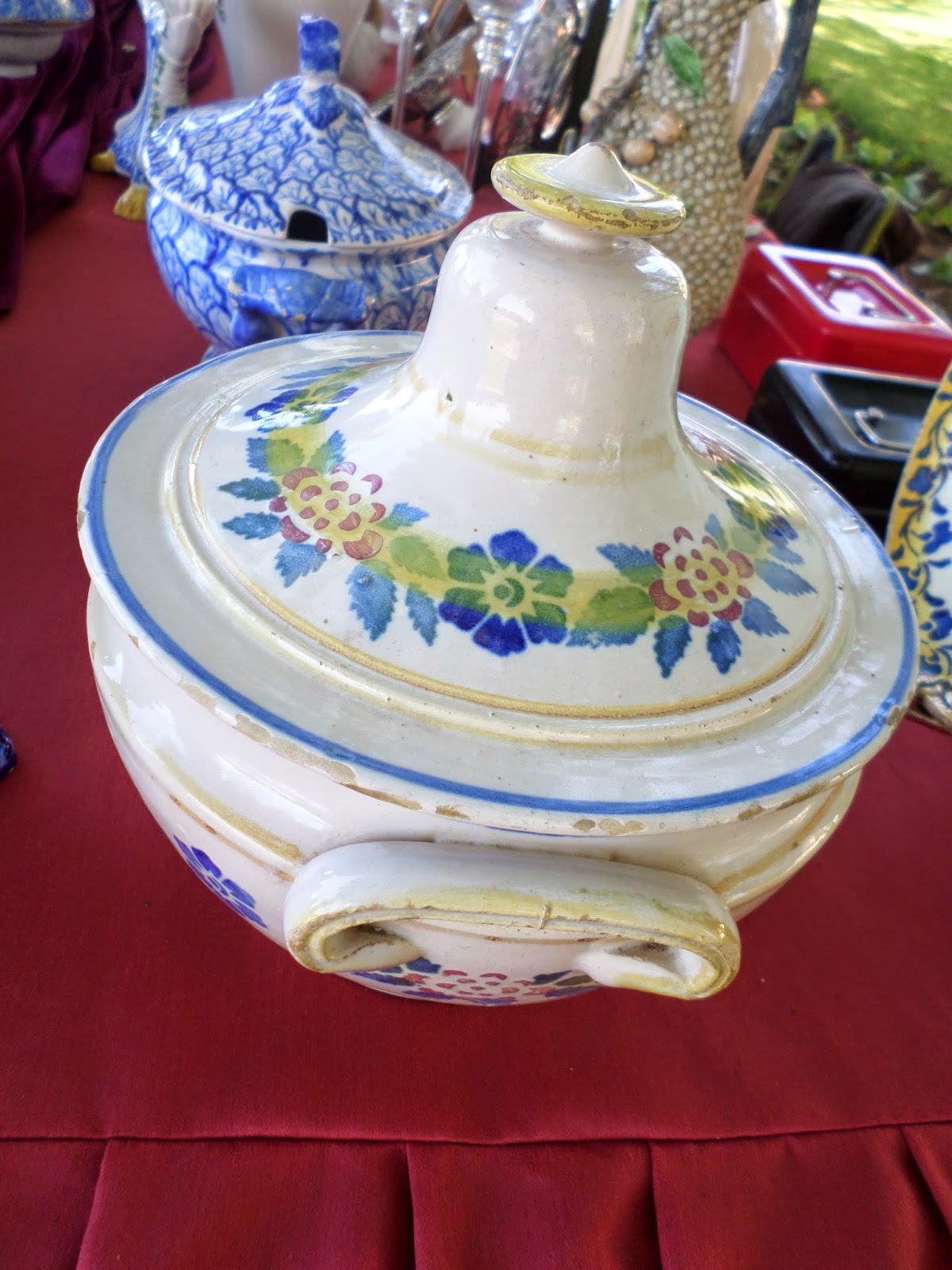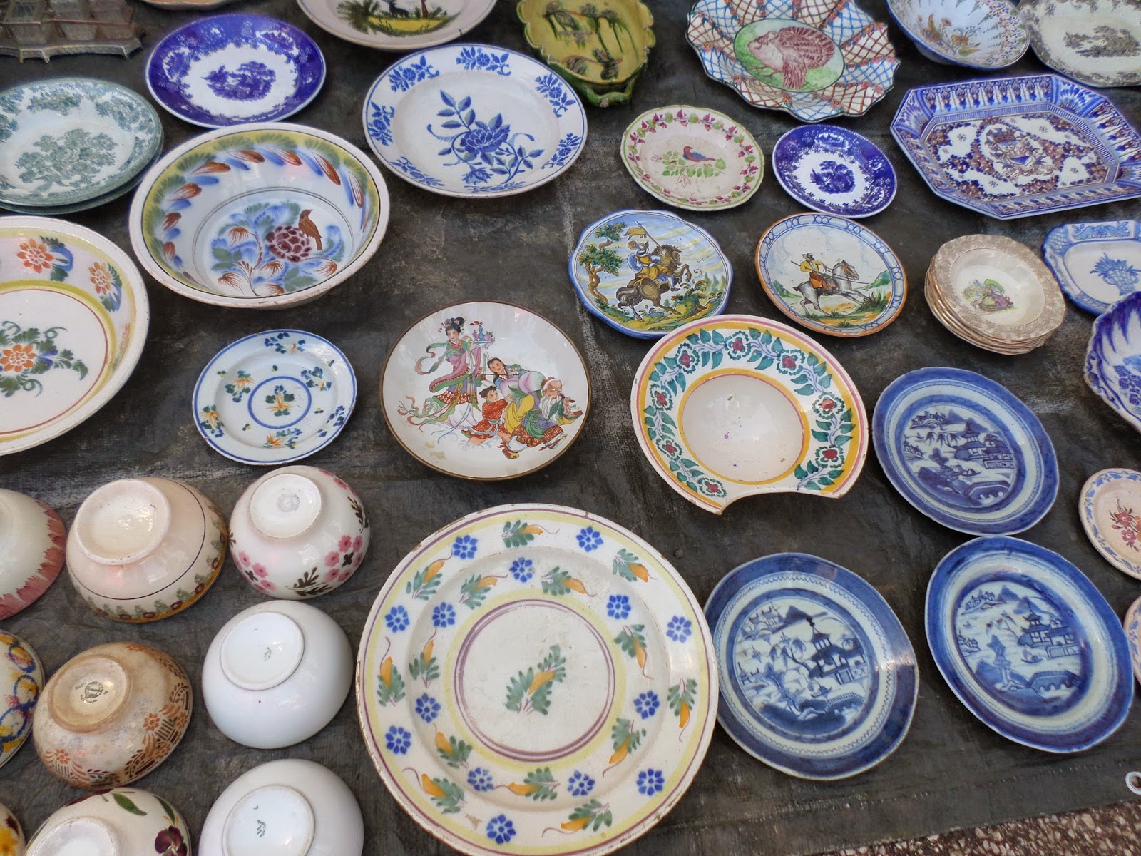 - Há quatro meses vi algumas destas peças na feira de Estremoz -, a taça oval na frente às reservas em azul com flores só foi vendida no domingo...
