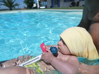 Como nos esquecemos de levar brinquedos para o Vicente brincar na piscina, não foi de modas e pegou no boneco do termómetro...