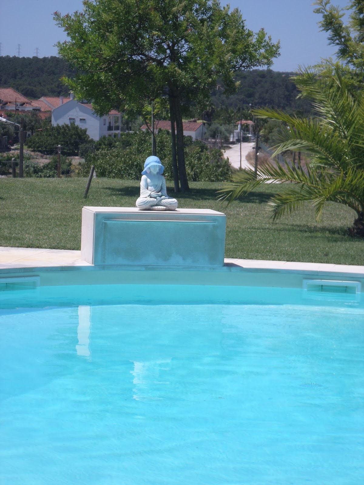 O chapéu do Vicente secava na cabeça do Buda, mas voou para a piscina, teve de ser pescado...