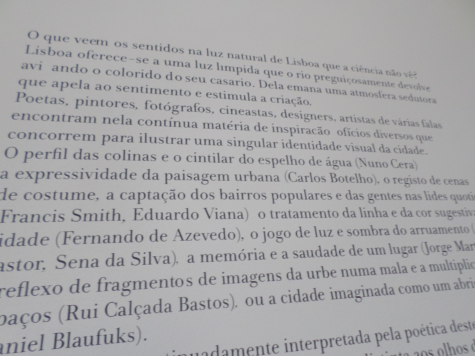 "E a luz de Lisboa é, de facto, uma luz que ilumina Lisboa. O amanhecer em Lisboa é especial. Primeiro, está tudo escuro. Depois, incrivelmente, o sol começa a despontar a leste. À medida que o sol sobe, o fantástico acontece e coisas que não conseguíamos ver, agora, são visíveis. Do castelo é que apreciamos bem. Ali, vista da muralha, Lisboa parece mesmo uma cidade vista a partir de uma muralha. Primeiro, não vejo nada porque há uma pedra, depois vejo telhados porque há uma ameia. Deixo de ver porque há nova pedra, agora volto a ver através de outra ameia. Ao longe, a Ponte 25 de Abril faz lembrar uma obra de engenharia construída especificamente para unir duas margens de um rio. Em nenhum outro lugar do mundo se une Lisboa e Almada daquela forma.