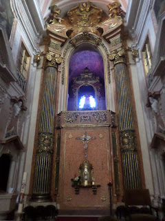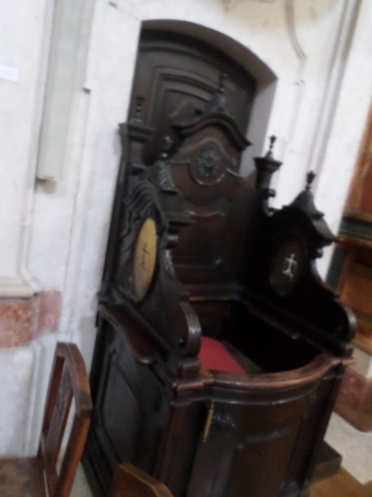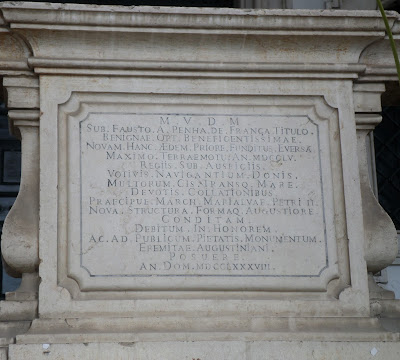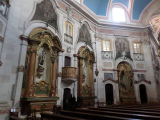A sacristia através de uma nesga da porta reparei num altar forrado a azulejos azul sobre branco, que me lembraram os do convento de Santa Cruz do Buçaco.