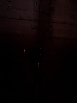 A porta da igreja com imensas ferragens, mas a pouca luz...