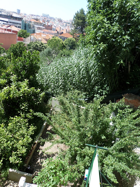 Vista do tardoz dos prédios e dos seus quintais de paredes meias com canaviais e rebentos de figueiras, árvore infestante que se ramifica brutalmente e deixa o chão empestado de folhas e figos.
