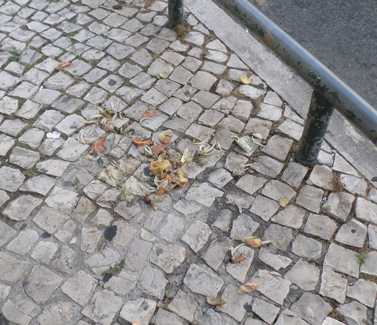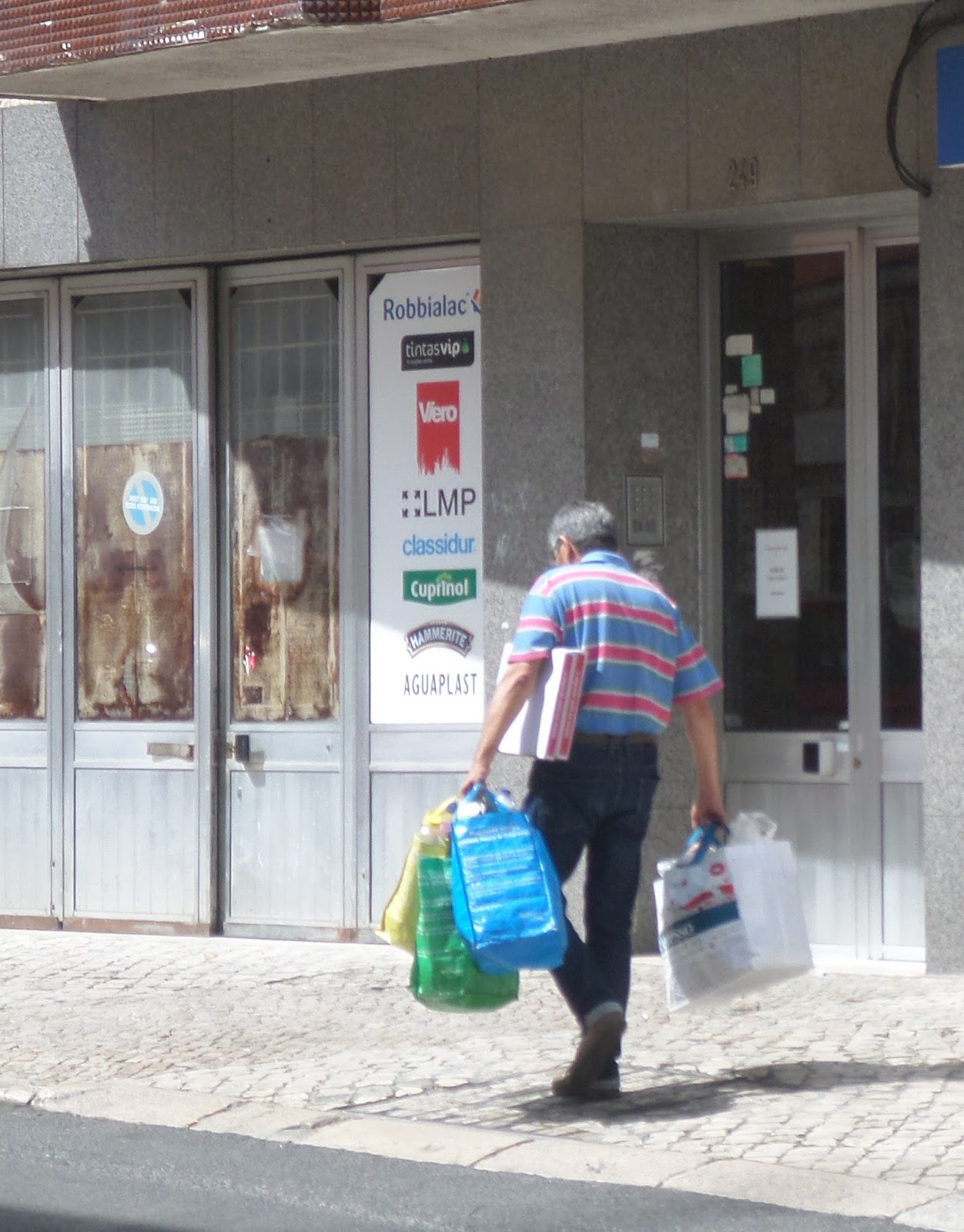 Mais à frente reparei num homem carregado de sacos com lixos para reciclar, ainda debaixo de um braço duas caixas de pizza, levava os sacos tão cheios, que lhe caíram na calçada por duas vezes objetos, logo se agacha e os apanha.Sendo que ainda teve de andar uns 400 metros, é de admirar e louvar!Um bom exemplo de cidadania!
