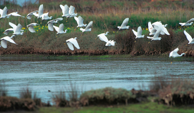 Fomos bem vestidos, estaria algum frio, o inicio e final deu-se nas imediações da Quinta do Paul, de cariz agrícola ao estilo ribatejano, pintada de branco sita numa pequena elevação à esquerda em relação ao caminho tomado, tudo em redor se mostrava vestido de erva viçosa , alguns de nós em terreno enlameado no descuido fatal com os ténis atolados na reserva húmida, delimitada por socalcos de argila amarela a fazer de mural baixo ornado a vegetação que na chegada da primavera já abrolhava verdejante clarinho, eram choupos, freixos, salgueiros e arbustos como o bunho, caniço, tabúa e espadana, que logo me reportou para a imitação da paisagem típica Bocage, por limitar lençóis brutais de água barrenta, teria chovido na véspera, salpicados de árvores de porte e grande cúpula com as raízes de molho em vasta zona alagada, um redondel de onde partiam riachos que se cruzam em meandros, debruados com plantas aquáticas e caniçal onde sobressaiam muitas garças, gaivina-dos-pauis, espécie rara no nosso País que por aqui também é rainha , outras aves, patos e claro avistavam-se neblinas enquadradas em contesto paisagístico onde a água é rei e os silêncios se quebram com o chilreio das aves, cenário místico que deslumbra o visitante.