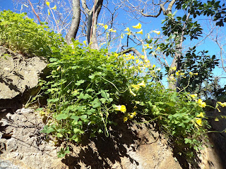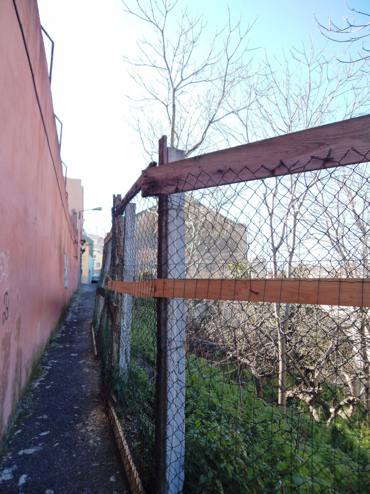 Parte da ribanceira caiu, e ficou assim emparedada com rede a passagem, sendo que outrora foi estrada é agora um carreiro estreito