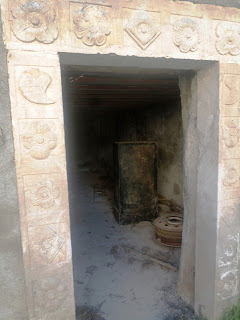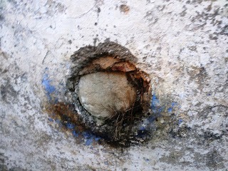 Detetei resquícios pintados em azul à volta de uma coluna redonda em pedra que foi partida(?), não sei o que aqui existiu (?).