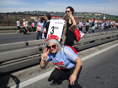 Um colega reformado do meu marido cumprimentou-o antes de passarmos à portagem da via verde, a que sempre usamos de carro, o garrafão mostrava-se entupido de gente ordeira e alegre a caminhar pelas margens, com o meio fechado por gradeamento alto, o poiso de partida dos verdadeiros atletas da meia maratona onde deixaram estendal de roupa pendurado que outros recolhiam para sacos pretos...