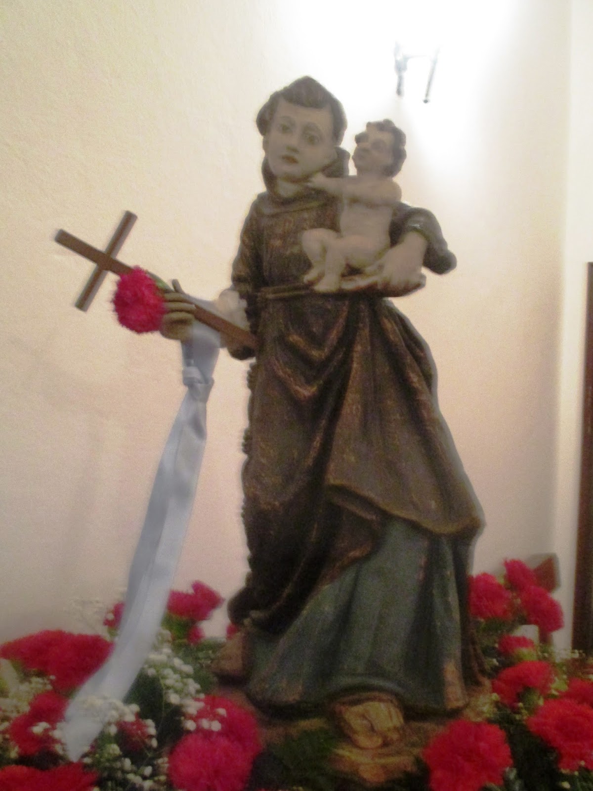 Comprei esta Imagem numa feira de velharias de Setúbal em gesso apresentava-se bustelado e incompleto, foi restaurado e vestido de fitinhas por mim, o meu marido fez-lhe a Cruz e o Menino também acrescentado.