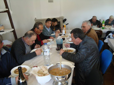 Almoço onde distingo na primeira linha o Arlindo Moreira (Pirão) do Casal S. Brás casado com uma filha da terra a Graciana, foi meu colega no Externato, em baixo o Fernando(Paciência) e na diagonal é um Paz