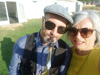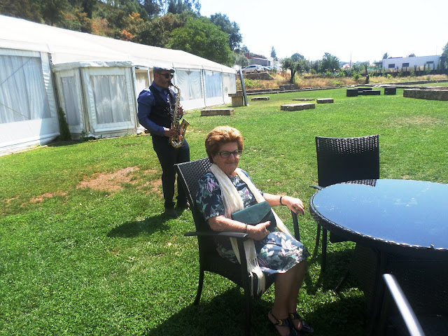 A minha mãe regaladamente sentada e feliz a ouvir o saxofonista contratado.