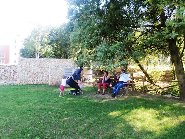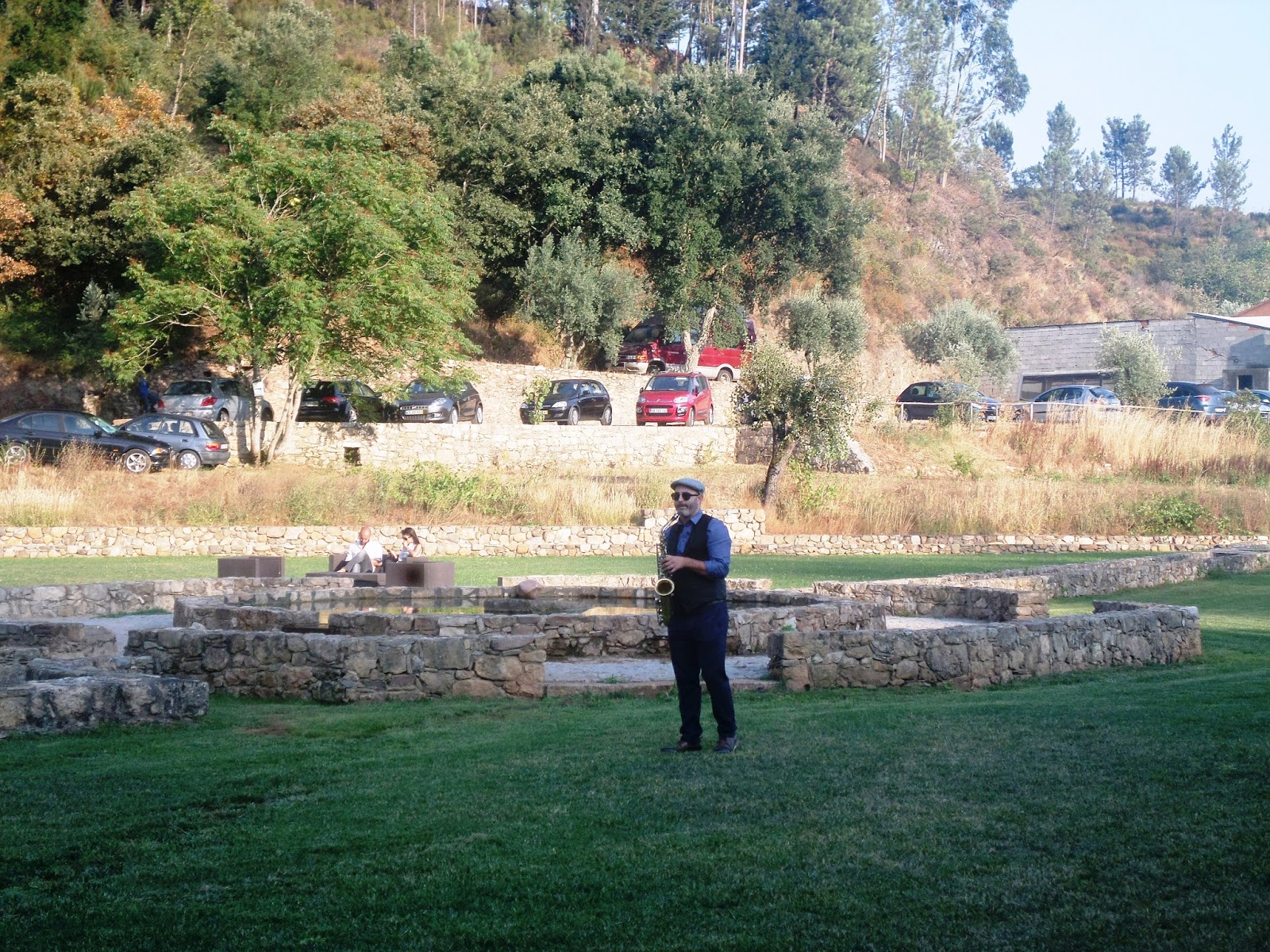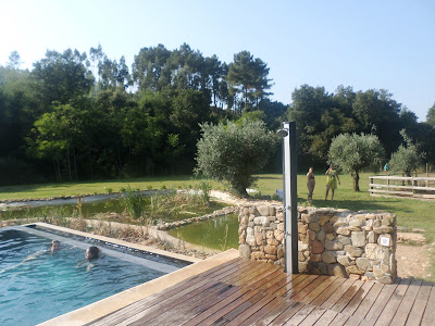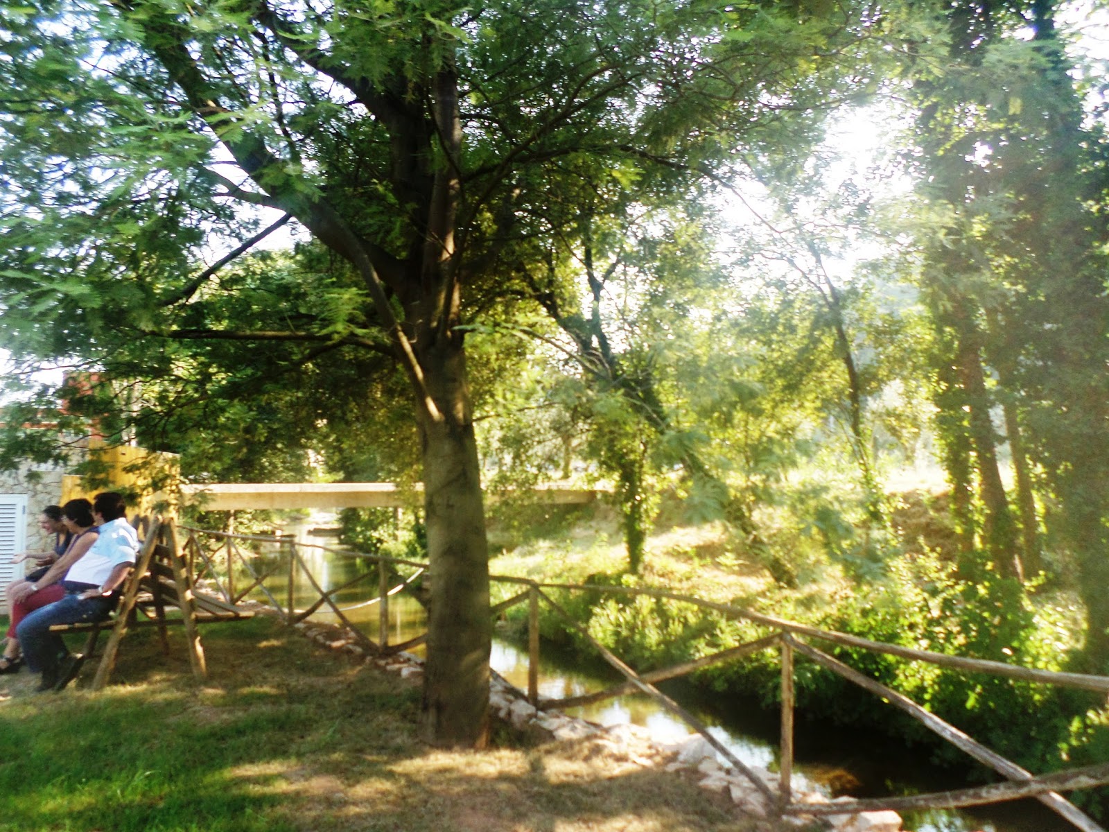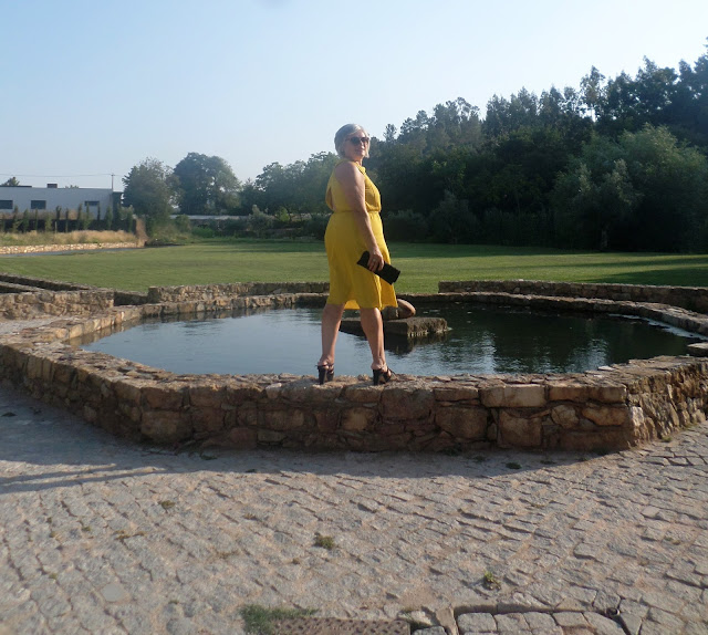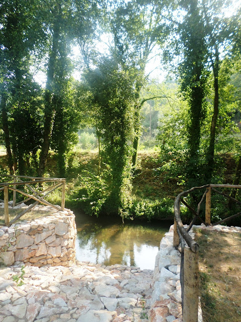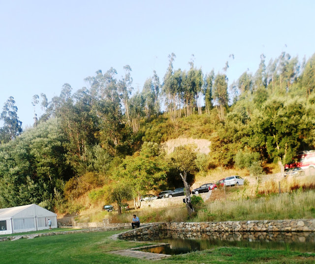 Havia gente refastelada em cadeirões, outros na jogatina das cartas e ainda outros no bar enquanto isso depois de ter feito a minha sessão fotográfica no espelho de água-, nada mais do que a simpática réplica da villa romana do Rabaçal, para logo me deixar partir relvado fora, debalde descalça que os pés já não cabiam nas sandálias, apesar dos pés doridos senti sensação maravilhosa com a relva a entrar pelos dedos, também com a terra macia nas margens da levada d' água, de forte corrente, quem diria por aqui fartura dela, sendo que o Nabão e o Dueça devem nascer do mesmo algar no Maciço de Sicó e o Nabão vai seco...Ora aqui ainda caminhava na calçada...