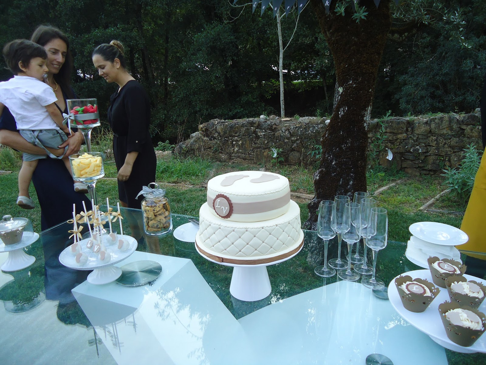 Final da tarde o abrir do bolo de batizado de dois andares, elegante e sóbrio individualizado com brasão das iniciais dos nomes dos príncipes "L V" Laura e Vicente , encimado pelos pezinhos, iguais ao motivo do convite.Na mesma sintonia outros bolos.
