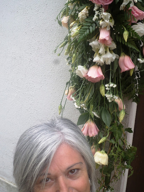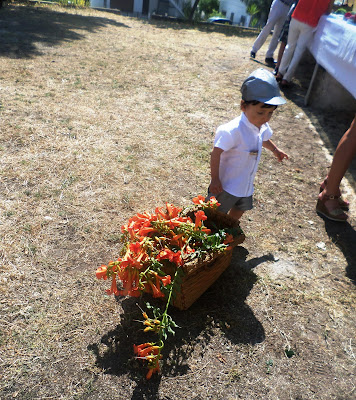 Trouxe de casa a cera de junco com os lençóis e logo me diz a minha filha que gosta dela, na volta tive mesmo de voltar a casa com o percalço da toalha de renda e na volta no jardim da D. Emília roubei do arbusto as campânulas laranja e que bem ali ficaram no adro.