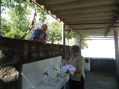 A prima São e o marido Freire no bar da capela de Santo António, gentilmente cedido ainda de janela fechada, onde o meu marido serviu cafés, cerveja, sumos e água, caricatamente não foi registado em fotos.Antigos comedouros de aviários em lata com canas da índia junto do bar