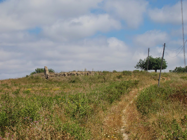 O caminho na frontaria da quinta segue a direito em frente com um mini portão em ferro que logo contornado e de volta ao caminho, que se estende em jeito de planalto, quase desértico, árido, pedregoso, de vegetação rasteira, na esquerda uma ruína de casa e depois no alto descida em declive e ao fundo, longe o miradouro do Rangel , onde as vistas de cariz deslumbrante, onde se avista a vista sobranceira ao Tejo,na colina da direita o Cristo Rei, na esquerda a Quinta de S. Lourenço e na frente o Tejo e Lisboa.