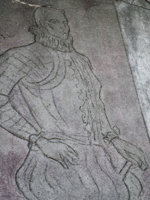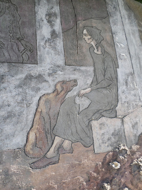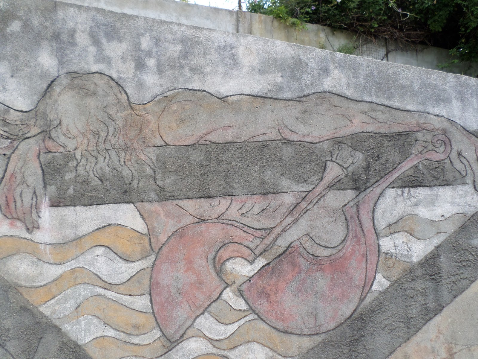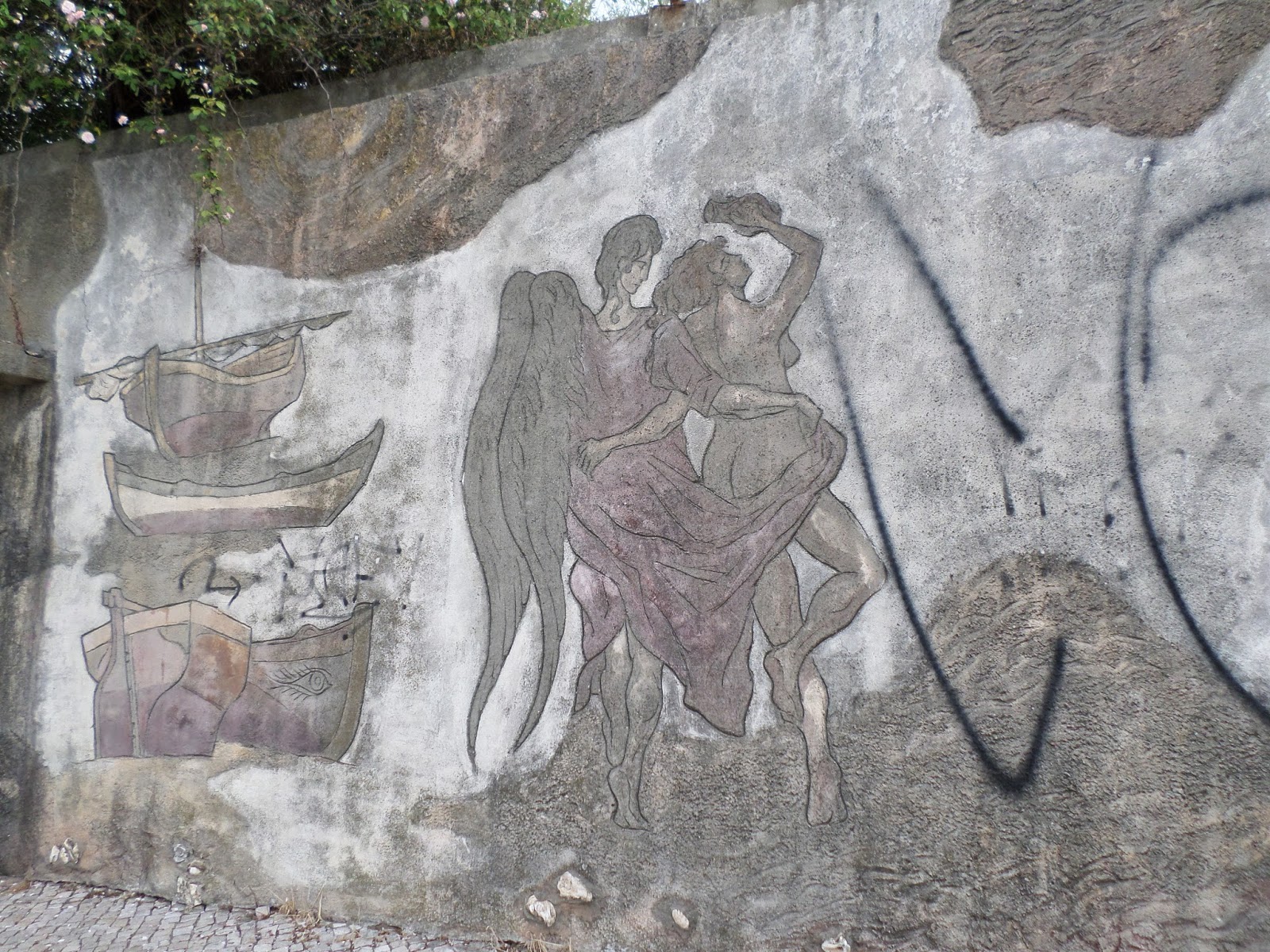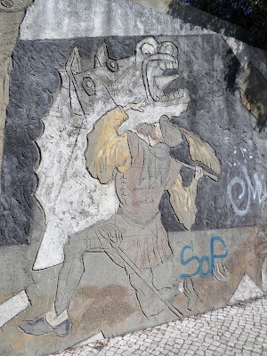 Escultura num mural da quinta onde viveu Fernão Mendes Pinto mandada executar pela Câmara de Almada em 1985. Escultor Pé Curto e o Pintor F. Bronze