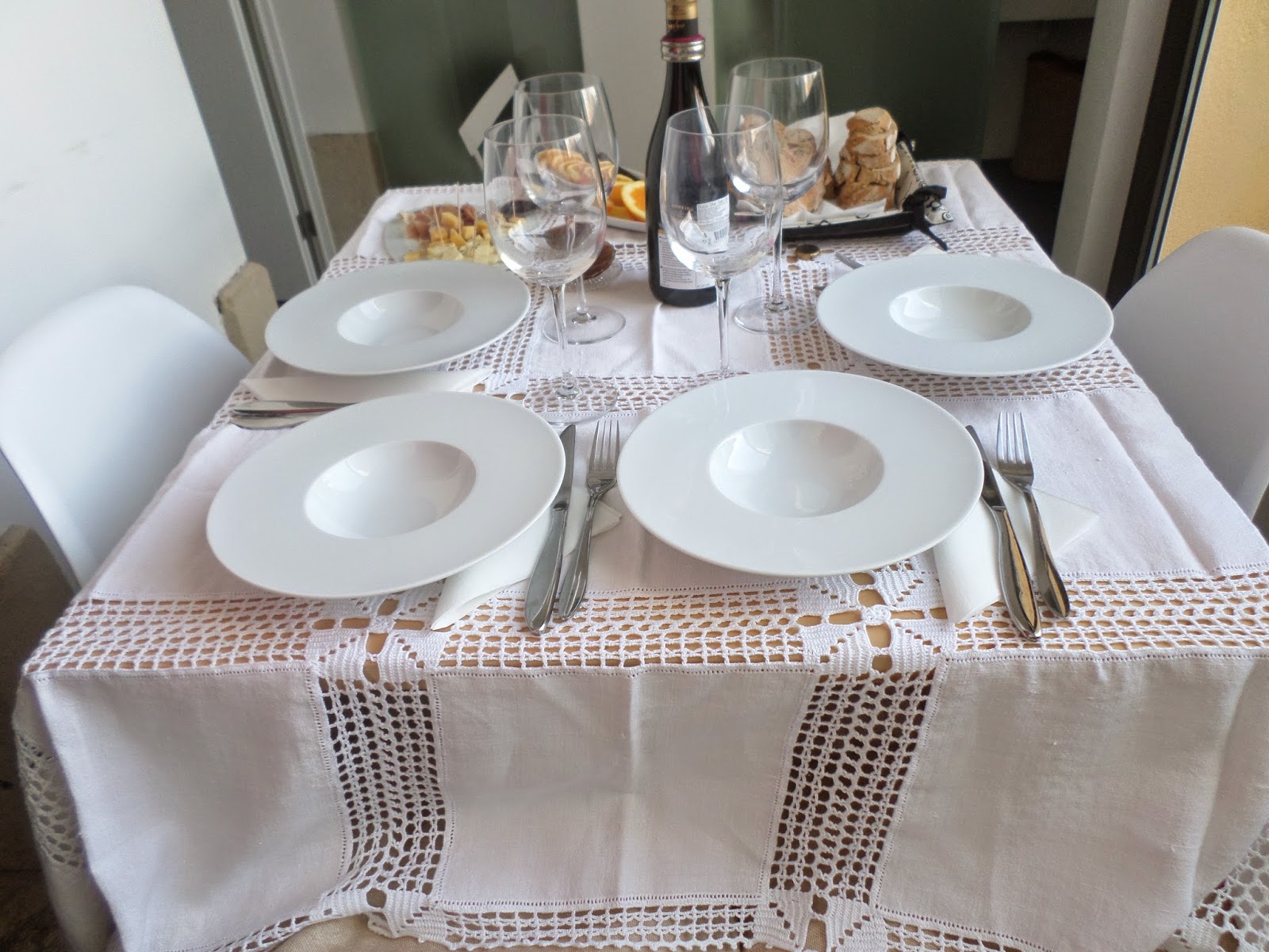 Mesa posta sob toalha em estoupa, que um dia foi forro de colchão de palha de centeio, crochetada por mim.
