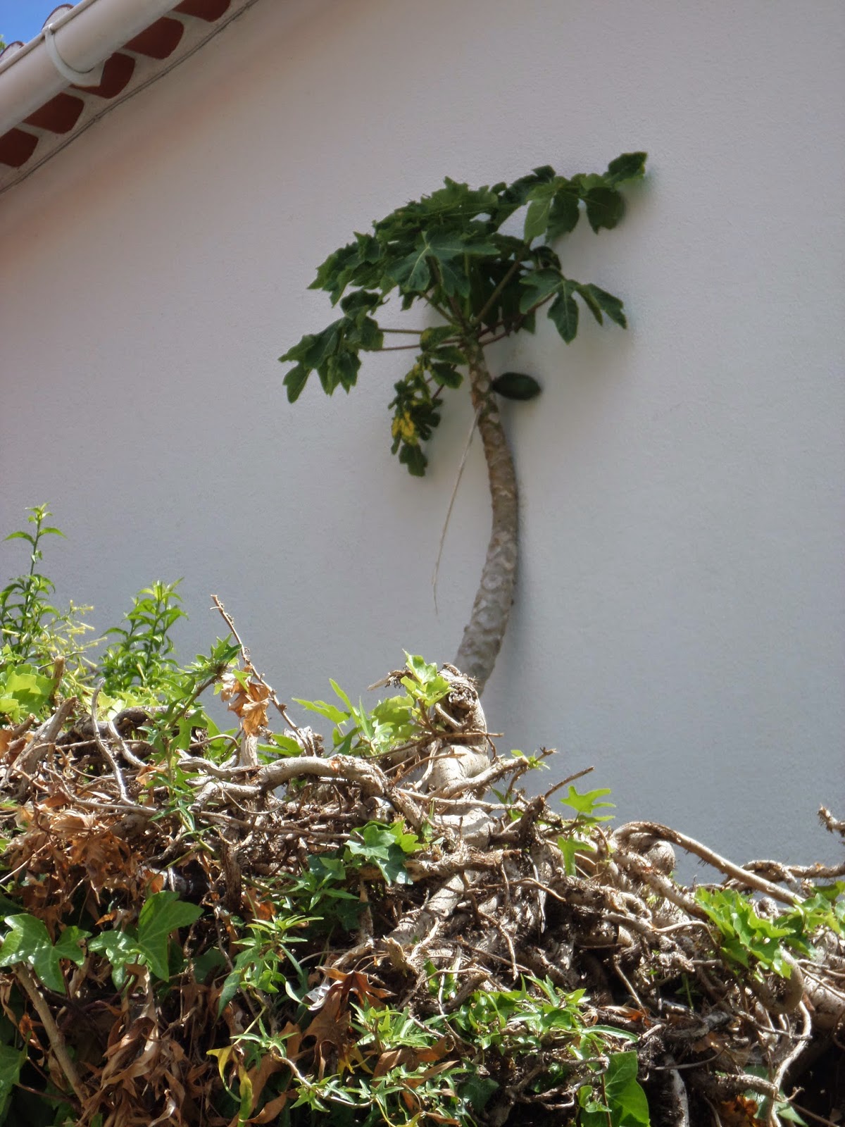 Depois subi pelo Bairro do Pombal construído em 52 de casas económicas de várias tipologias, onde outrora houve vinha com boa produção de vinho de venda reconhecida - , descobri um mamão de encosto numa casa assim protegido, sendo uma árvore tropical aqui cresceu e deu frutos.