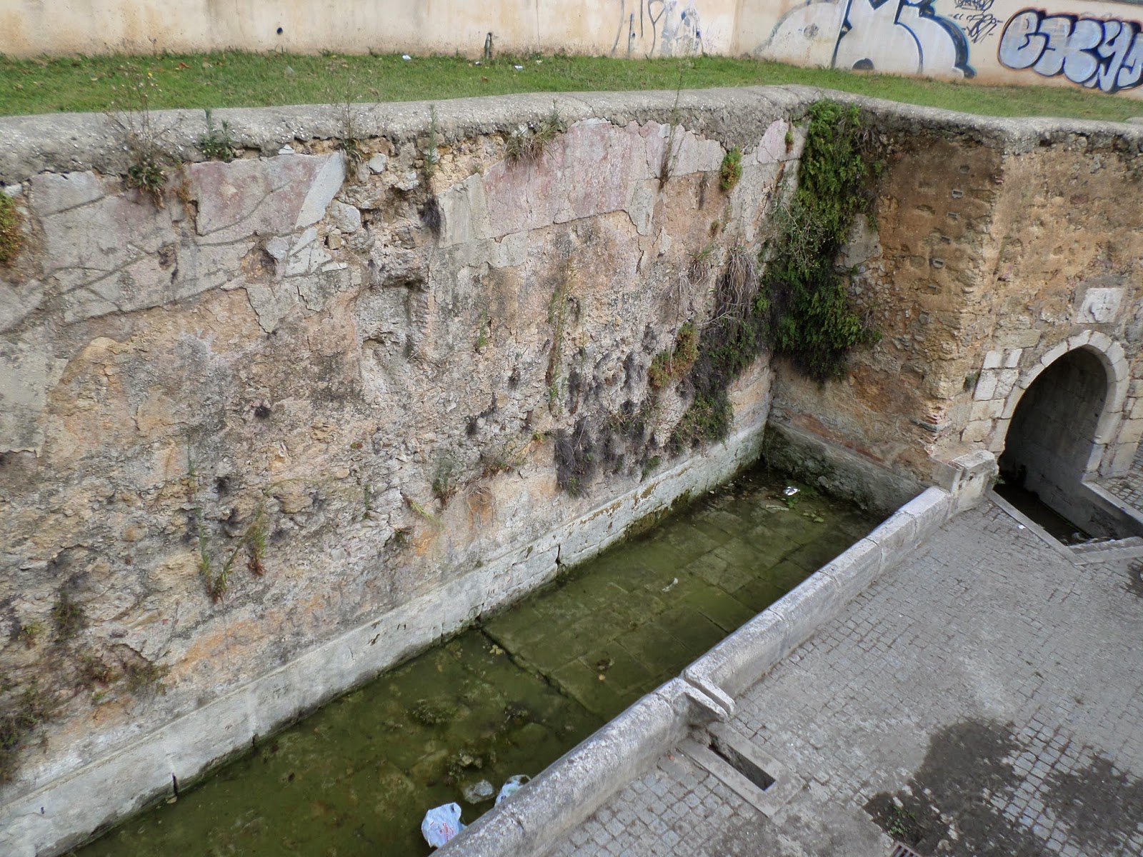 | Por cima do tanque nota-se na parede que foi retirado um brasão ou uma imagem de Santo (?) que estaria envolto com arco em massa, que dele ainda se vêem resquícios |