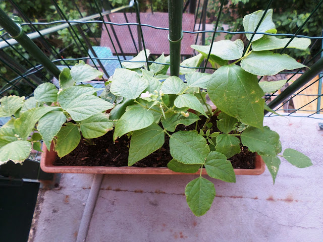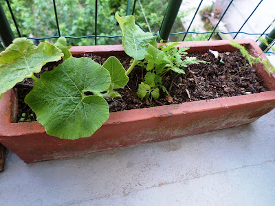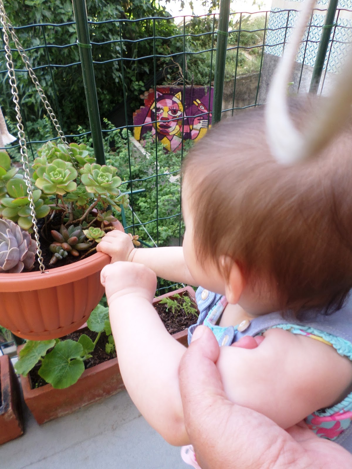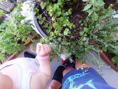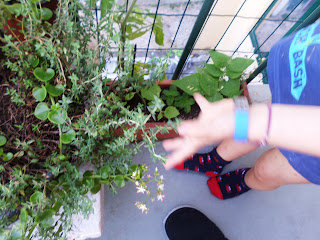 No varandim em "L" no tardoz da casa da minha filha plantei uma pequena horta nos canteiros das flores e das ervas aromáticas, a pensar nos meus netos; Vicente e Laura. Porque de pequenino é que se aprende seja o que for. O Vicente quando o chamo para ir regar a horta deixa tudo para me acompanhar.
