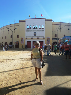 De estômago refastelado voltamos ao local da arenaUm andar de varanda engalanada com motivos ligados aos toiros