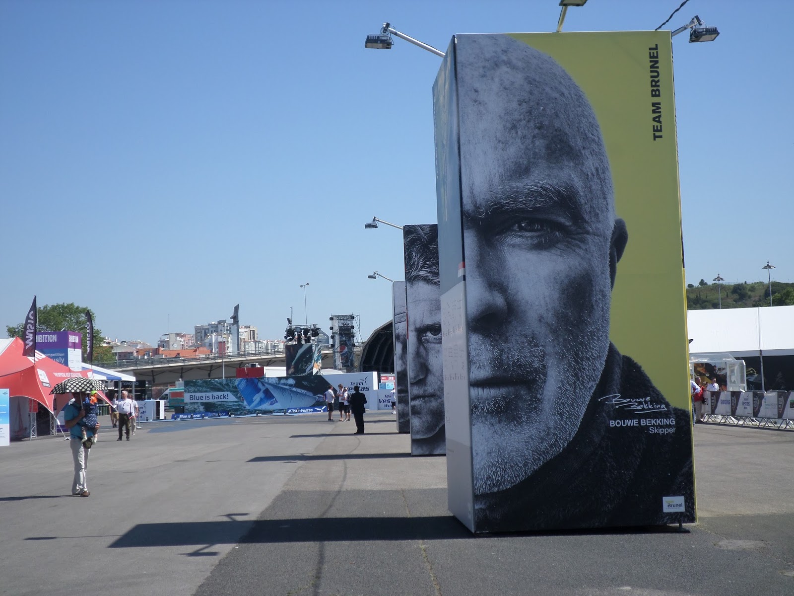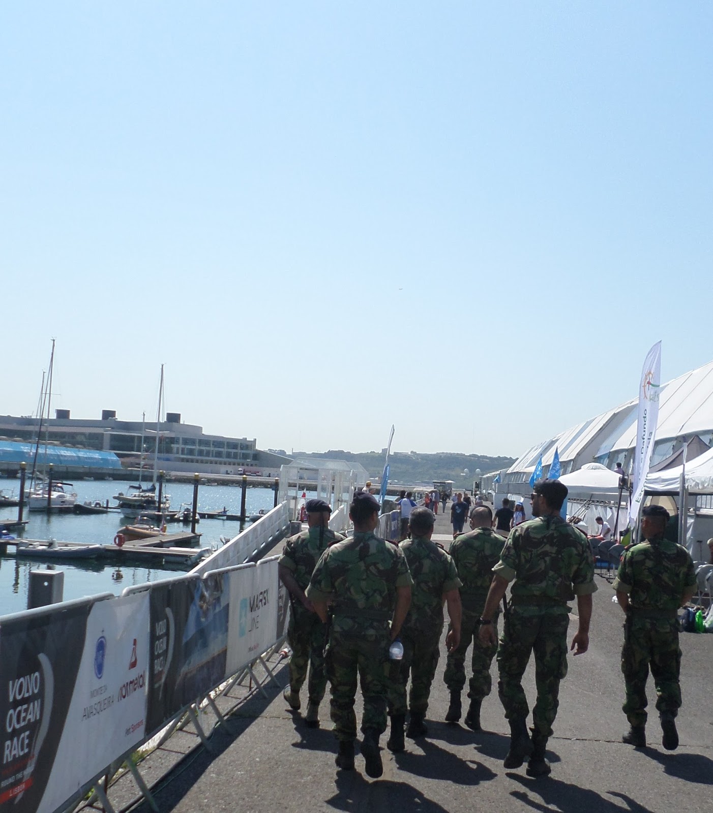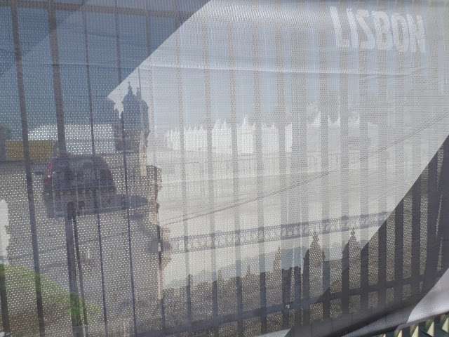 De comboio até Algés. Depois de um descampado as redes de proteção do evento a norte, com paisagens das várias paragens pelo Mundo.