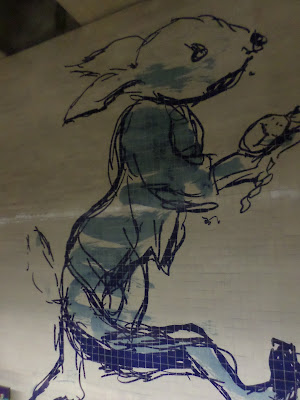 Na sua primeira vez no Metro do Cais do Sodré ponto de encontro com o avô, ficou-se a mirar os gigantes coelhos do mural azulejar...