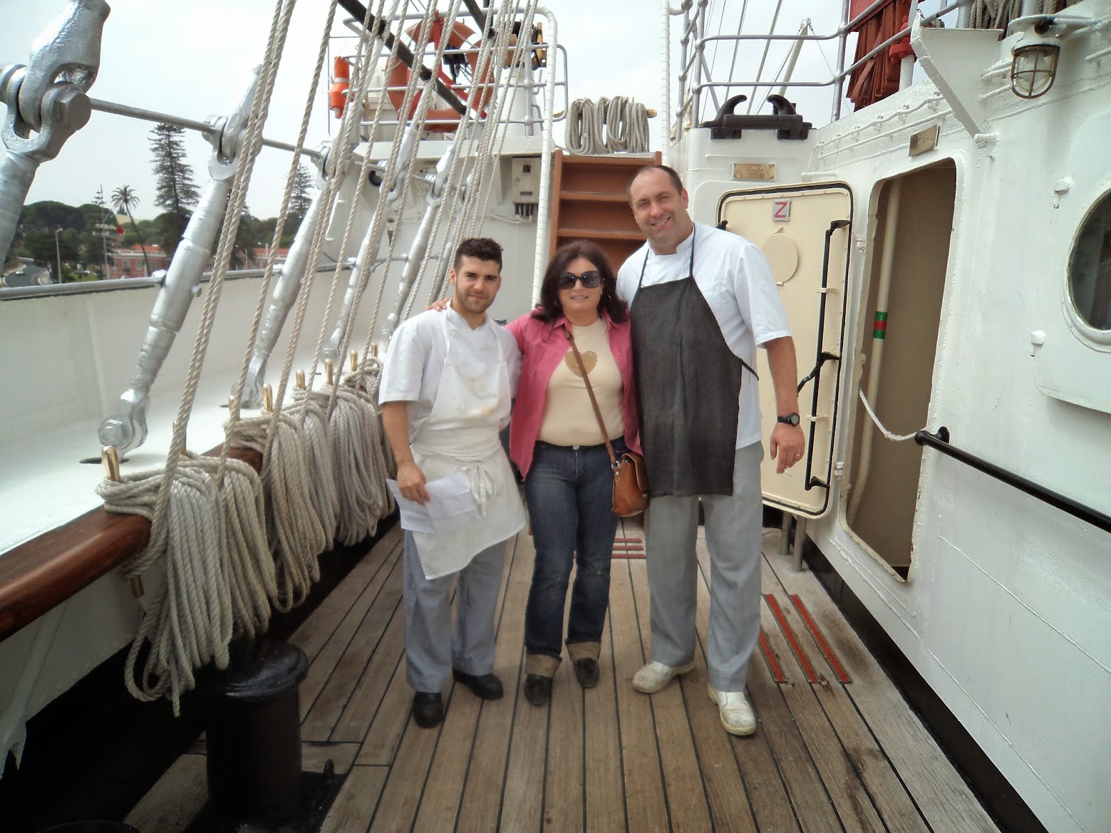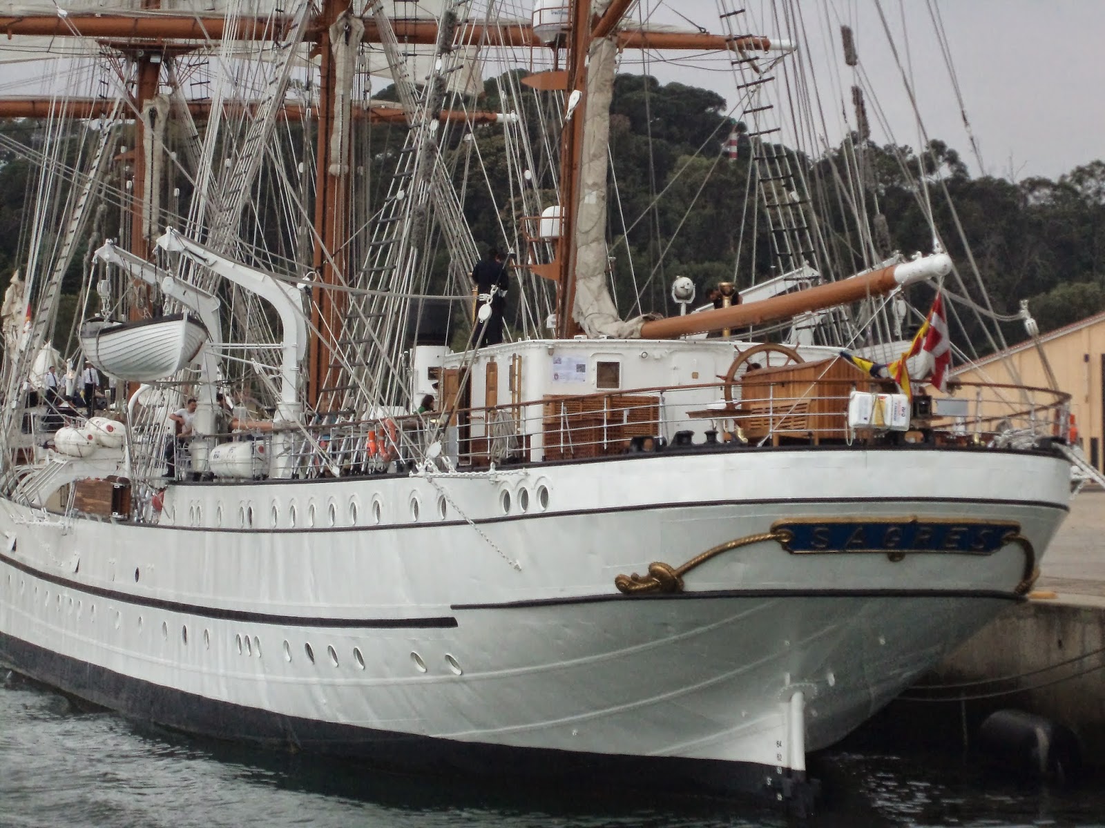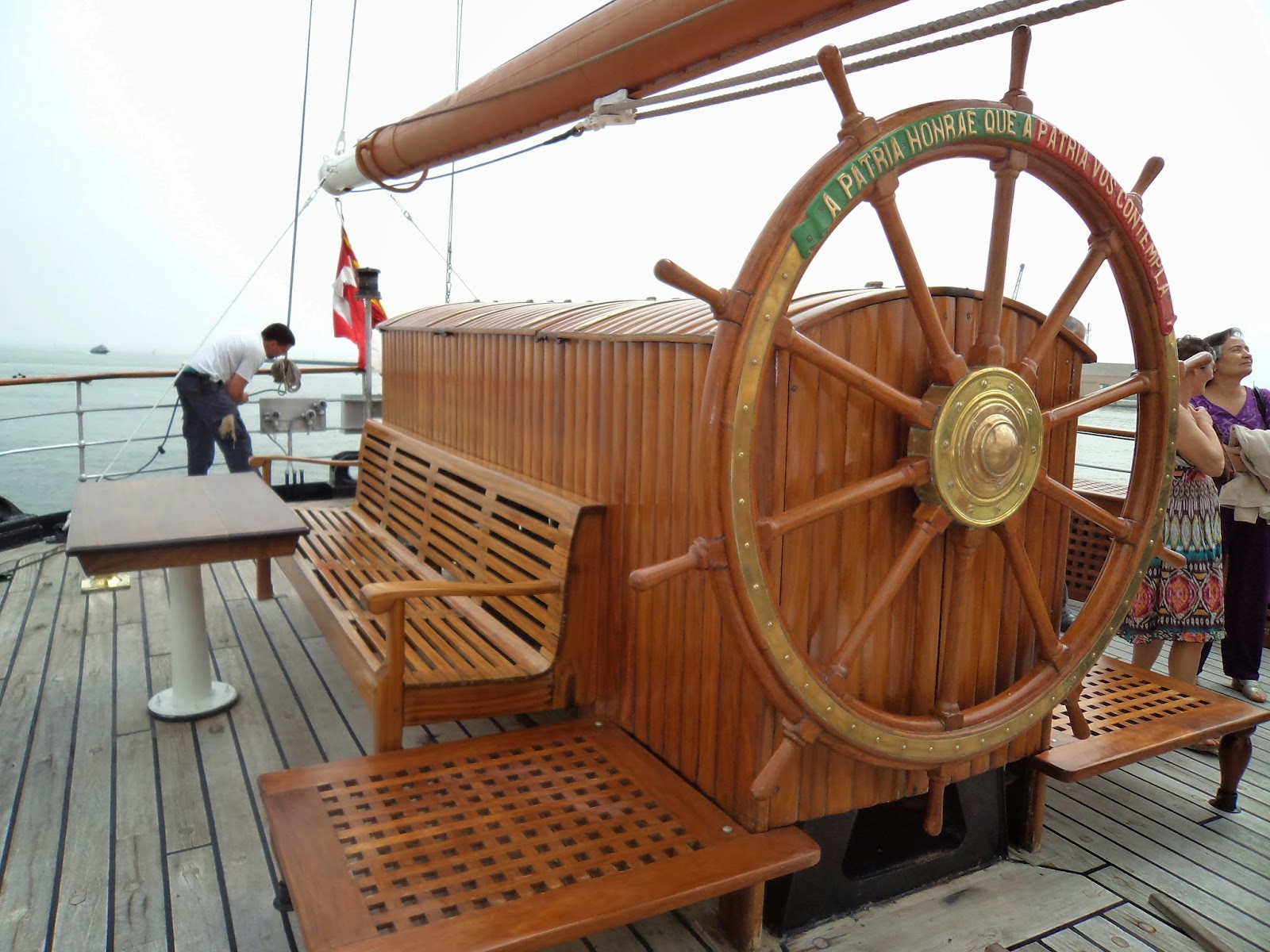Gostei de sentir um veleiro a sério: cordas, lemes, mastros - tinha uma vela aberta com a Cruz de Cristo - na ré existem mesas com bancos corridos em madeira para se lanchar ao sabor da maresia.Navio elegante e belo com latões a reluzir oiro.
