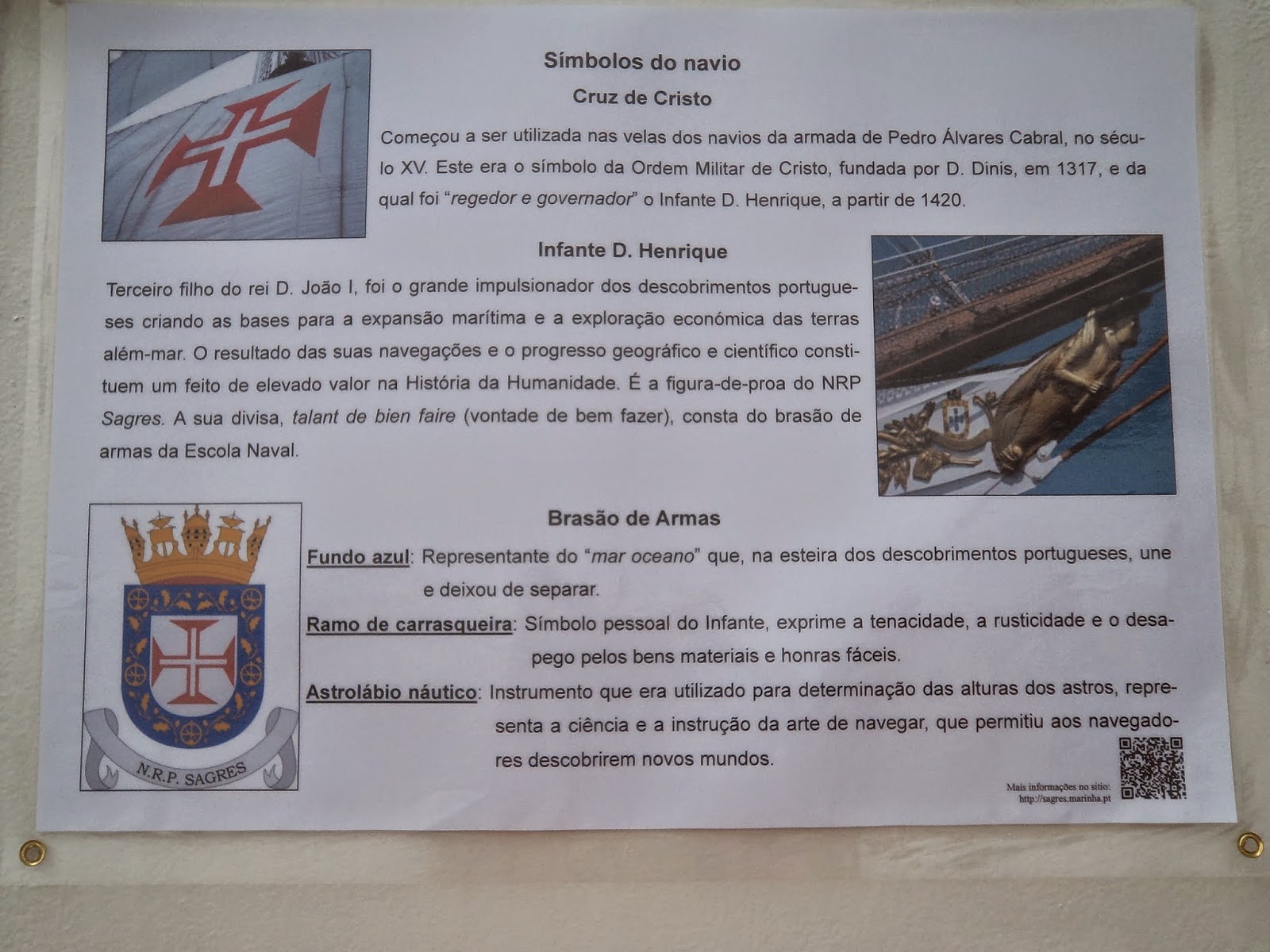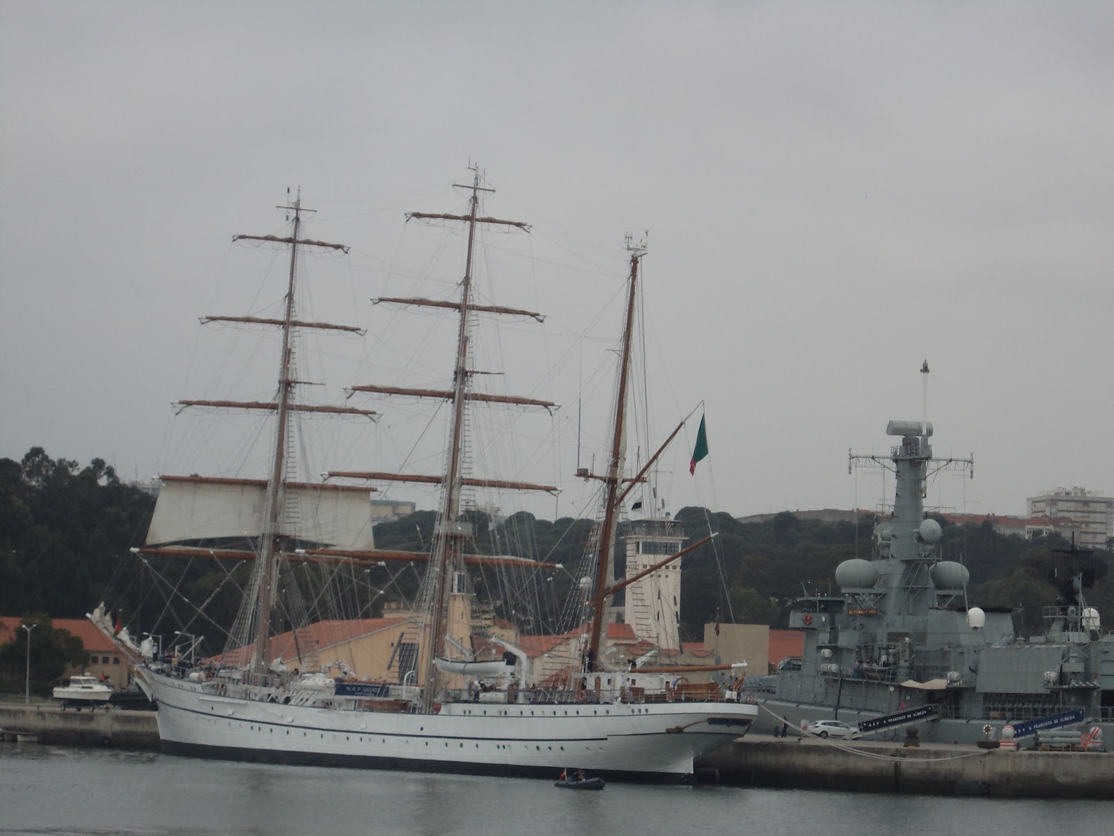 Ancorado na Base do Alfeite. Visitei-a na minha primeira vez.Gostei de sentir um veleiro a sério: cordas, lemes, mastros - tinha uma vela aberta com a Cruz de Cristo - na ré existem mesas com bancos corridos em madeira para se lanchar ao sabor da maresia.Navio elegante e belo com latões a reluzir oiro.
