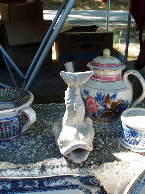 - Aqui foi vendida uma peça BORDALO PINHEIRO, genuína, que jamais tinha posto os olhos em cima-, enfusa ou jarro em forma de mulher com tetas...porque o eram nessa forma iguais às das ovelhas. Peça de beleza rara, pelas cores, castanhos, amarelos, verdes, e o vidrado exuberante a realçar as diras tetas -, uma com ligeiro descaído à outra , e os bicos uma obra d'arte...uma peça de excepcional valor credetício se acaso estivesse a emitir um parecer técnico...tão vidrada com a imagem real que me cativou...mal se vê na foto.