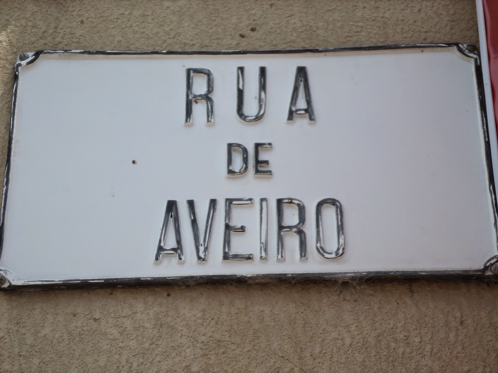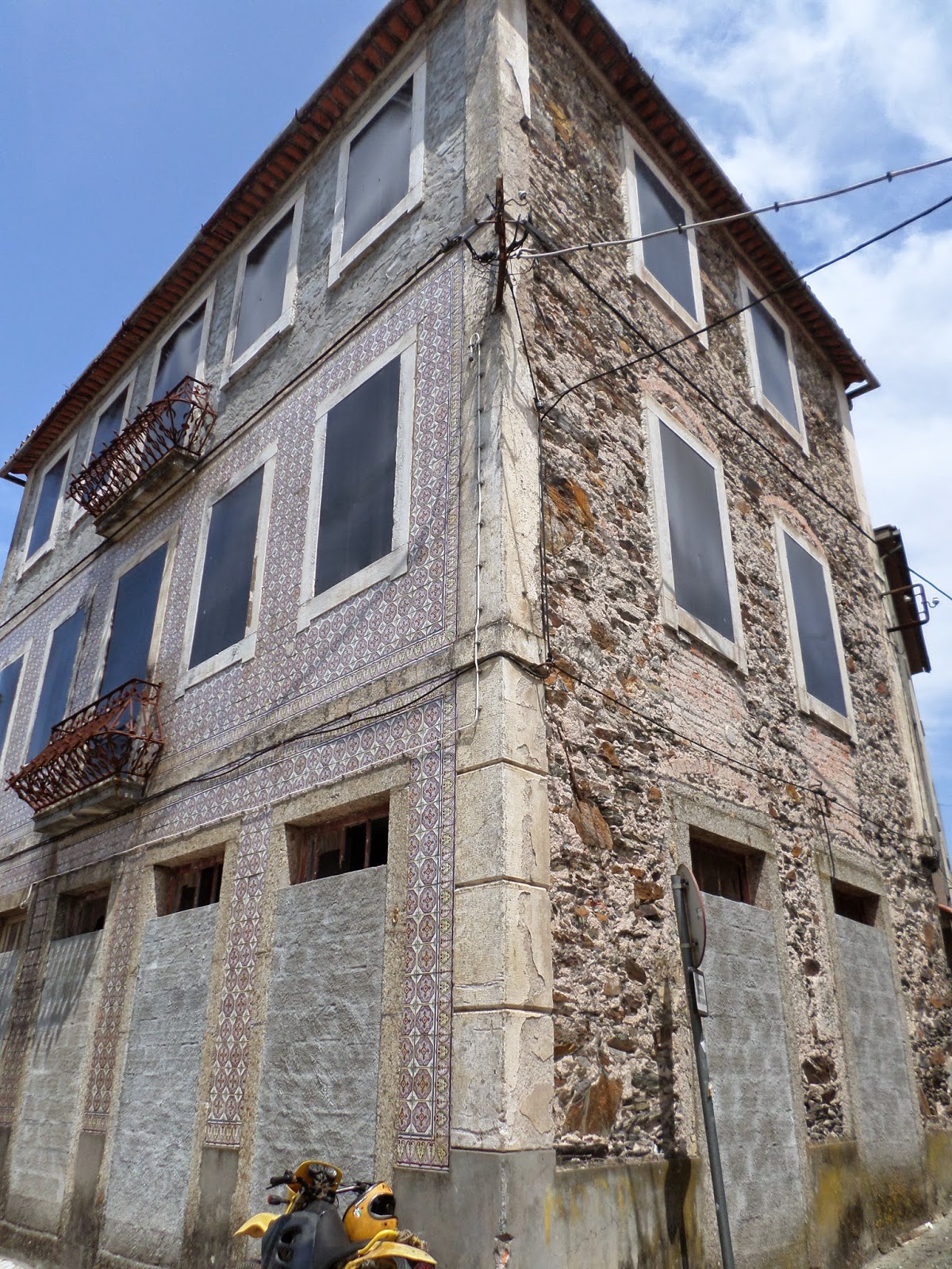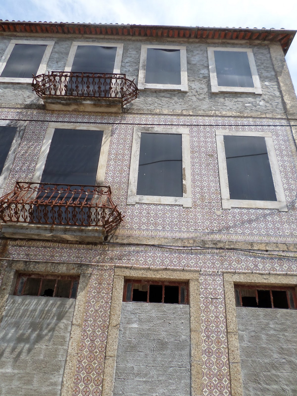 Encontrei no início da rua de Aveiro um prédio alto forrado na frontaria a azulejo.