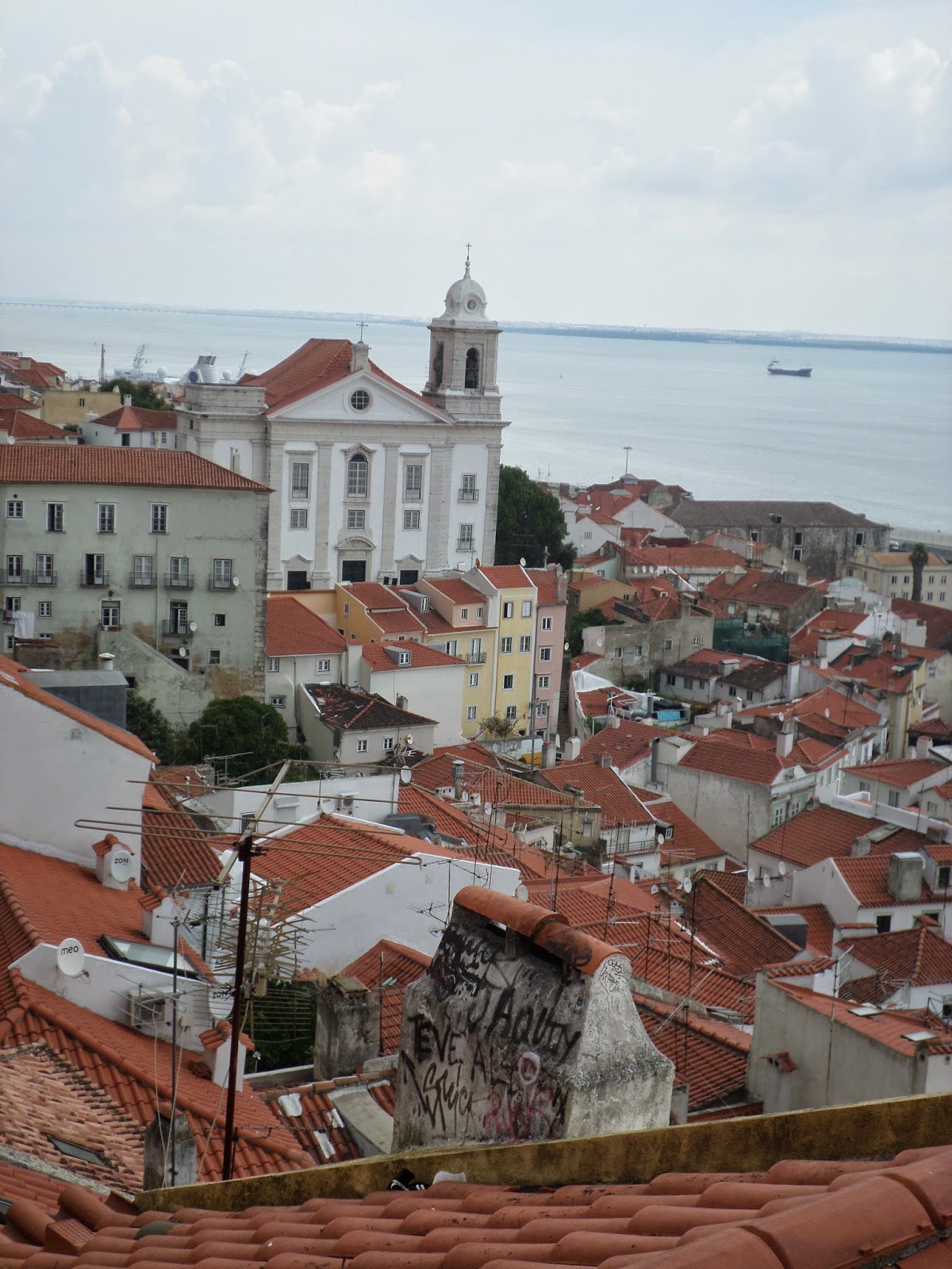 Nada faltou desde a tábua de queijos e presunto, os croquetes, a boa salada com oregãos de Sicó, arroz branco, uma das minhas especialidades para segurar a lasanha, que não era muita...salada de frutas, café, bagacinho do nosso lavrado em garrafa de vidro antiga servida em cálices diferentes de todas as cores e tamanhos e tarte de requeijão. O dia estava a convidar. Alfama é lindíssima com tantos miradouros cheios de gente, tantas frestas de caras para o rio, a caminho da Graça sempre a subir...