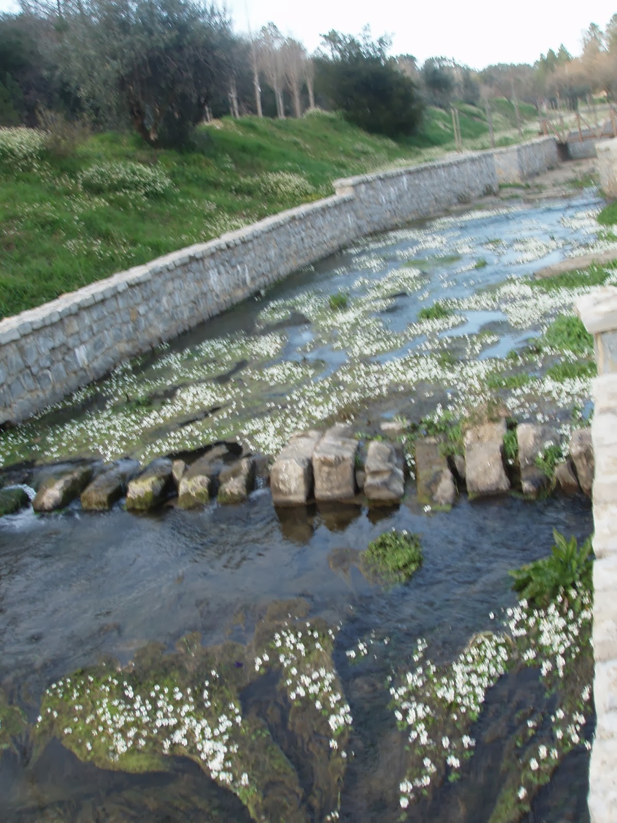 Entrar no caminho do moinho na beira do frondoso eucalipto para ver grãos de milho a saltar da mó e dos taleigos enfarinhados dos fregueses entregues à porta de casa pelo moleiro Ti Eduardo Dias na companhia da sua carroça puxada pela mula - do alambique, o cheiro da aguardente a sair por tubinhos a escaldar, e no brasido as batatas roliças espetadas num arame em roda , da linda ponte debruada a grandes lajes, da eira repleta de agriões floridos , desde sempre ouvi falar da apanha de agriões na ribeira do Nabão, assim no meu tempo de infância se chamava, a Fátima Duarte do Moinho das Moutas os apanhava, mas não são agriões, antes ranúnculos aquáticos, de nome científico Ranunculus peltatus. Mantos floridos de branco como se fossem tapetes... Lembrança bucólica dos munhos, azenhas minúsculas serpenteadas ao longo de ribeiros estreitos, as levadas ou ribeiro do munho, ladeados por muros de pedra seca e no curso principal o moinho com uma enorme roda de madeira para a elevação da água, tradicional neste rio até Tomar. Na requalificação foi colocada uma réplica da roda de alcatruzes debalde não funciona...e o restaurante parece fechou...Tristeza!