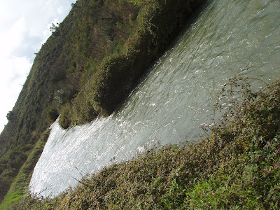 Tinha sido uma semana de chuva, a sul sem pinga de água e a norte a partir daqui muita água junto a uma fila de poldras já descarriladas, em minutos a água atinge a cota máxima para de repente entrar pelo canal estreito da brecha da poldra descendo em pressa se inclinando para poente onde fui atrás dela evidenciando ser ali uma gruta onde desapareceu para se instalar a dúvida, afinal a água que passa em Tomar não é a do Nabão de Ansião, mas somente do afluente o Agroal -, então onde fica a água do Nabão? Será ali na imediação do Deserto, onde o Prof Salvador Dias Arnaut referenciou uma fonte, nascente, algures na imediação da gruta onde vi a água desaparecer para alimentar a ribeira de Abiul e,...