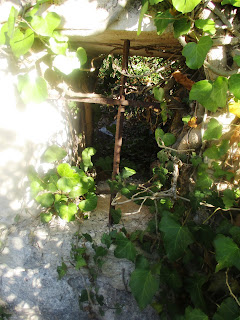 Imagens retiradas da net, julgo fizeram parte de um concurso de uma filha da senhora que mora junto do cemitério de Almoster (?).Não distingo na foto se no tardoz da capela foi a casa senhorial, porque tendo a capela a orientação nascente/poente com entrada para um átrio, era habitual as capelas privadas terem ligação da casa à capela e aqui não seria por a parede entestante a nascente ser do altar, a sul entestava com a estrada, pelo que apenas a ter ligação o seria a norte. Quando visitei o local não me lembrei desse facto, por isso não reparei na parede, no que ainda dela existe, se tinha abertura para a capela.O contraste d'ontem e d'hoje em Grande a ruína! Hera que sempre dela ouvi falar no tempo da apanha da azeitona para as cortar uma vez tomando posse da árvore a matam em três tempos...O gradeamento das guaritas cobertas de hera, tudo é um mar de hera!